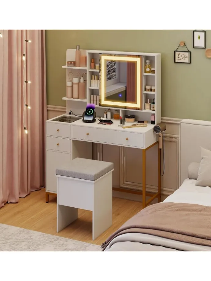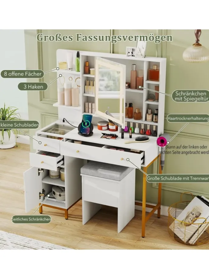Verbessern Sie Ihre tägliche Routine mit diesem Frisiertisch-Set. Dieser Schminktisch verfügt über eine eingebaute Ladestation zum bequemen Aufladen von Geräten. Der HD-LED-beleuchtete Spiegel bietet einstellbare Helligkeit und 3 Farboptionen für Ihre Bedürfnisse. Sie können mit reichlich Stauraum einschließlich eines Spiegelschranks, Schubladen, mehreren offenen Regalen und mehr organisiert bleiben. Dieses stilvolle und praktische Schminktisch-Set ist perfekt für Ihre Lieben zu besonderen Anlässen und vereint Funktionalität und Eleganz auf wunderschöne Weise.
