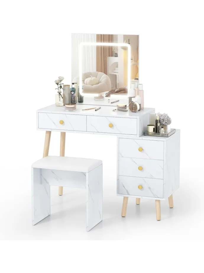 Kreieren Sie ein atemberaubendes und praktisches Schminkset, das sich Ihrem Lifestyle anpasst! Der quadratische LED-Spiegel bietet 3 Lichtfarben und eine einstellbare Helligkeit, damit Ihr Make-up sowohl tagsüber als auch nachts makellos gelingt. Mit 2 Hauptschubladen, 3 Seitenschubladen und einem vielseitigen Seitentisch haben Sie vielfältige Aufbewahrungsmöglichkeiten – perfekt zur Organisation oder als eleganter Nachttisch.