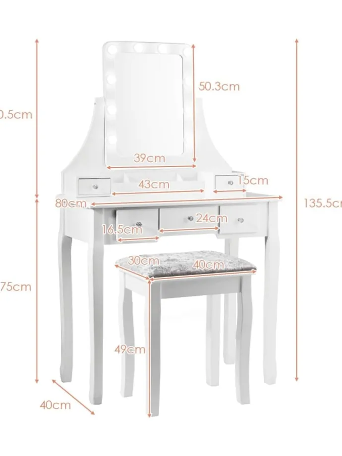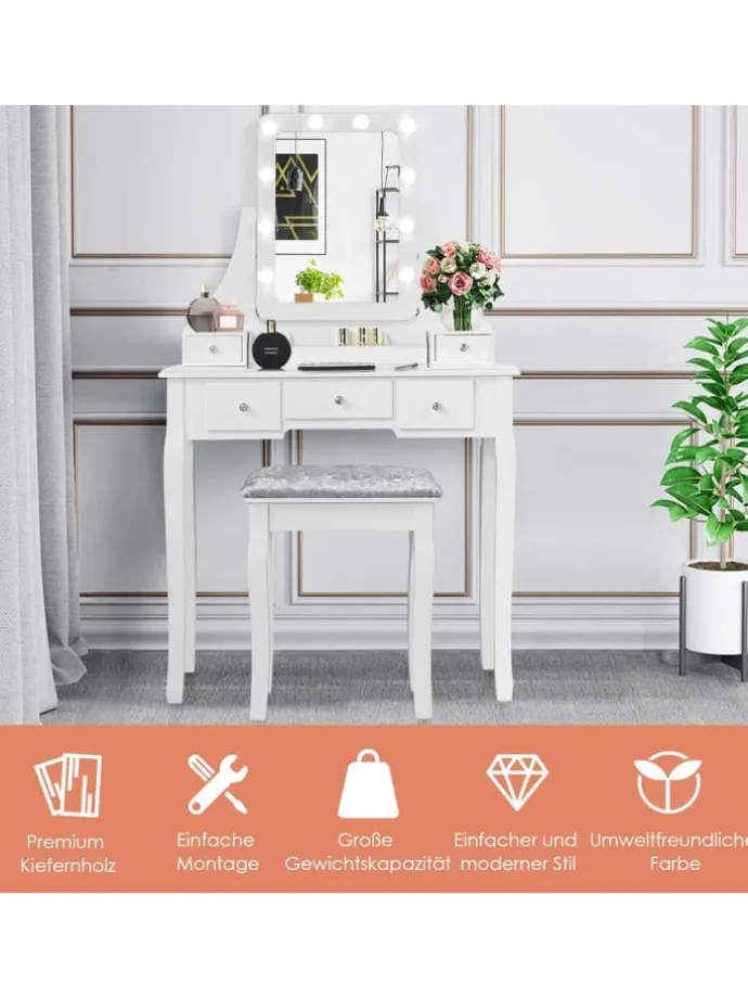 Dieser Schminktisch hat ein schlichtes und klassisches Design mit 5 großen Schubladen, einer herausnehmbaren Trennwand und einer geräumigen Tischplatte, um Schmuck, Kosmetik, Parfüm usw. einfach zu verstauen. Die Tischplatte ist aus hochwertigem MDF hergestellt, dessen glatte Oberfläche leicht zu reinigen ist. Darüber hinaus wird der Spiegel mit 10 LED-Leuchten kombiniert, um die Umgebung zu beleuchten. Mit seinem um 360° drehbaren Design kann der Spiegel in den von Ihnen gewünschten Winkel gebracht werden. Der Hocker bietet Ihnen überlegenen Komfort und zuverlässige Unterstützung.