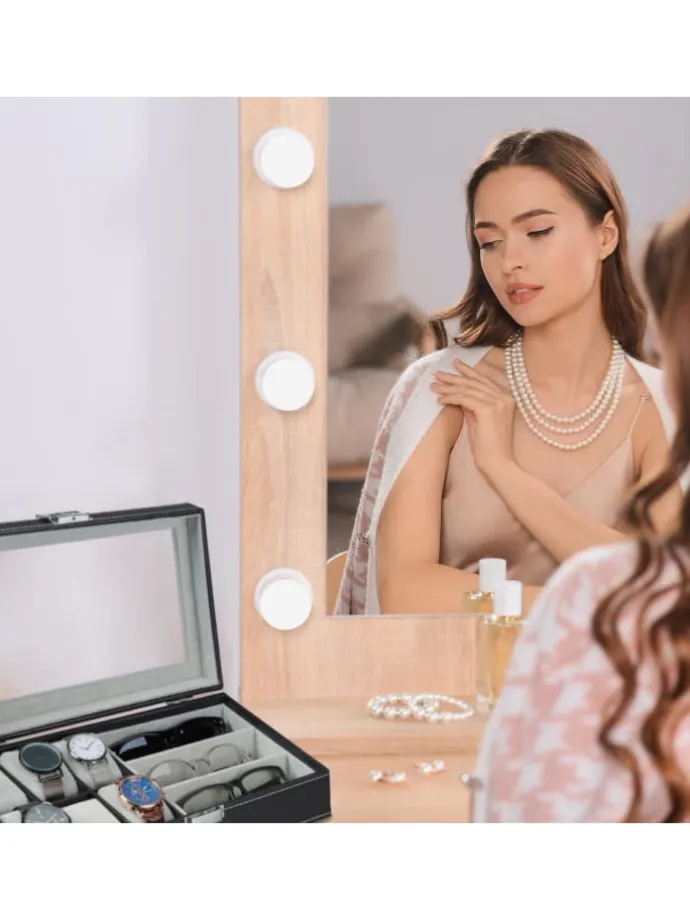 Mit diesem Schmuck-Organizer bewahrst Du Deine liebsten Schmuckstücke geordnet und übersichtlich auf. Die großen Fächer bieten Dir ausreichend Stauraum für Brillen, lange Halsketten, Armbänder oder Ohrringe – auch Deine Uhren finden auf einem der 6 Uhrenkissen ihren Platz. Der weiche Bezug der Schmuckbox bietet dabei Schutz vor Kratzern. Mit dem Sichtfenster und dem eleganten Design in Lederoptik wird der Schmuckbehälter zu einem tollen Hingucker auf Deinem Schmink- und Frisiertisch.