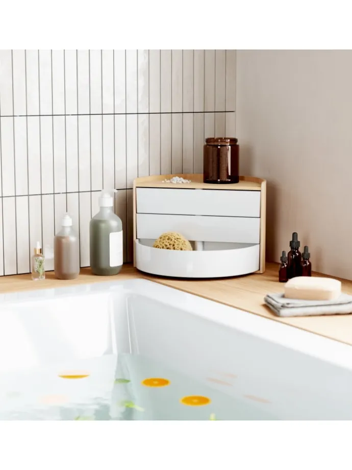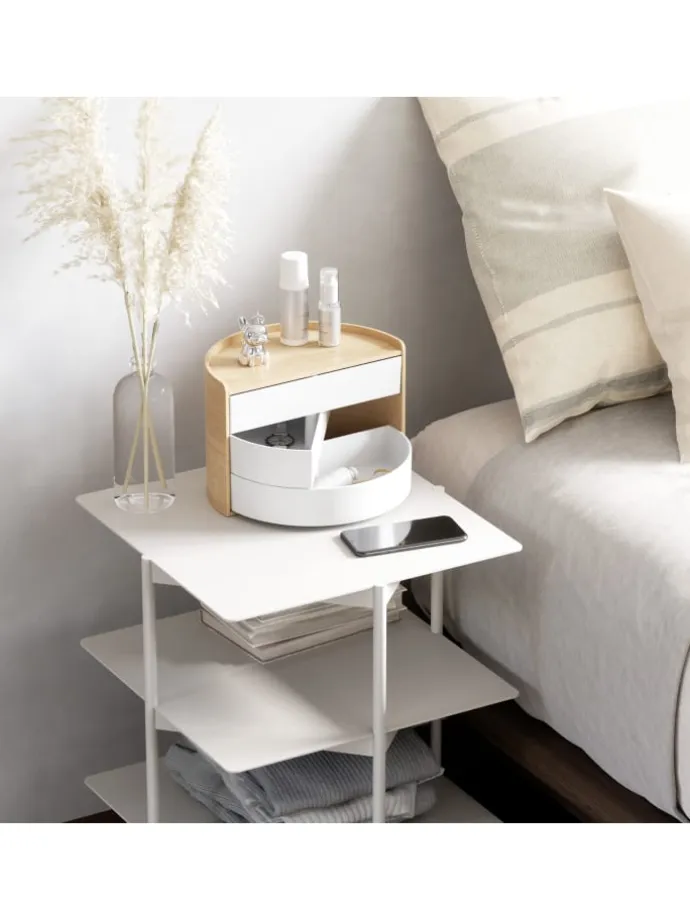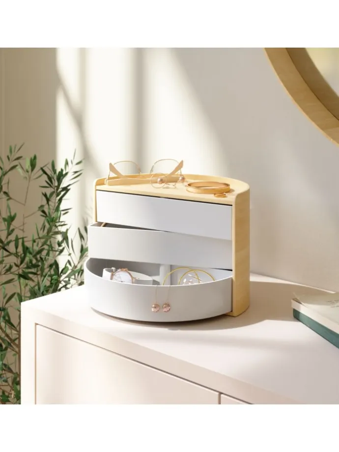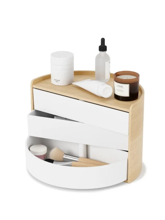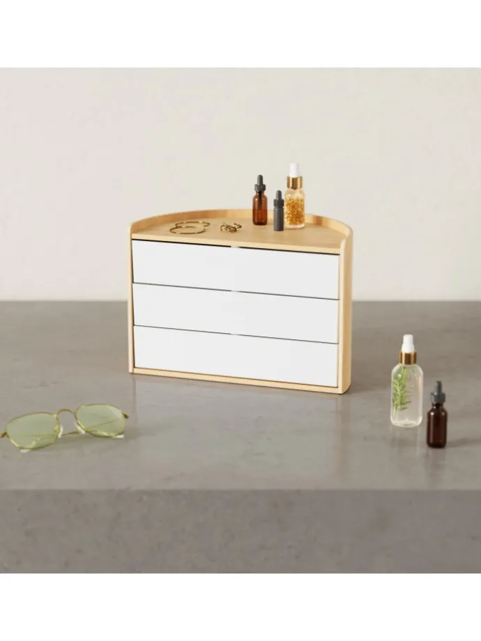 Moona Organizer mit seiner halbrunden Form und seinen wunderschönen Holzakzenten ist ein garantierter Zugewinn auf jedem Schminktisch, Waschtisch, Schreibtisch und Sideboard.