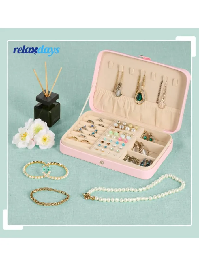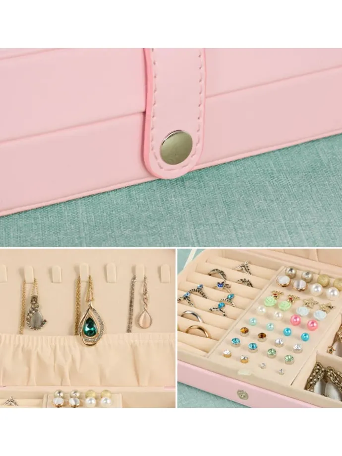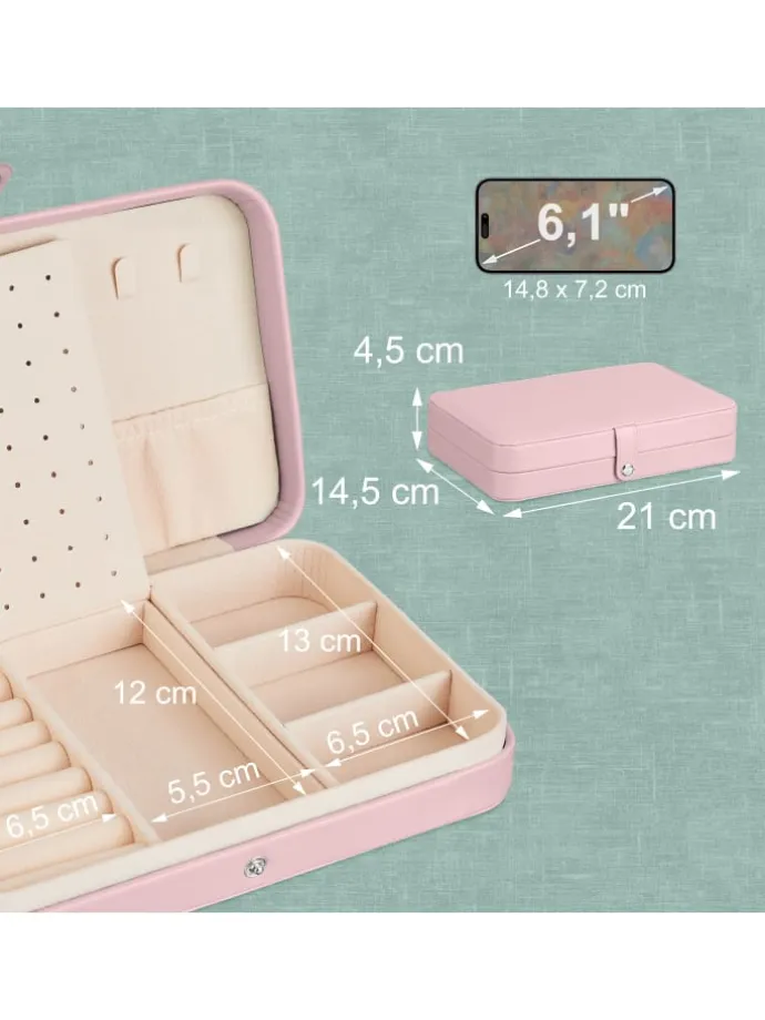 Mit diesem Schmuck-Organizer bewahrst Du Deine liebsten Schmuckstücke geordnet und übersichtlich auf, sowohl zu Hause, als auch auf Deiner nächsten Reise. Dank der kompakten Größe kann die Schmucktasche überall hin mitgenommen werden, während gleichzeitig ausreichend Platz für Ringe, Ketten, Ohrstecker und mehr geboten wird. Auch auf der Kommode überzeugt die Schmuckaufbewahrung durch schlichtes Design und Lederoptik. Der weiche Bezug schützt Deine Schmuckstücke dabei zuverlässig vor Kratzern.