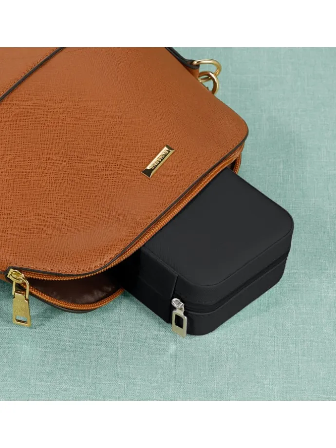 Mit diesem Schmuck-Organizer bewahrst Du Deine liebsten Schmuckstücke geordnet und übersichtlich auf, sowohl zu Hause, als auch auf Deiner nächsten Reise. Dank der kompakten Größe kann die Schmucktasche überall hin mitgenommen werden, während gleichzeitig ausreichend Platz für Ringe, Ketten, Ohrstecker und mehr geboten wird. Auch auf der Kommode überzeugt die Schmuckaufbewahrung durch schlichtes Design und Lederoptik. Der weiche Bezug schützt Deine Schmuckstücke dabei zuverlässig vor Kratzern.