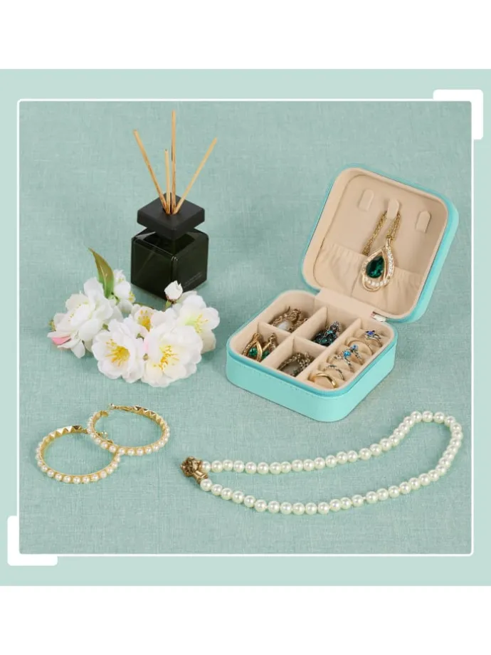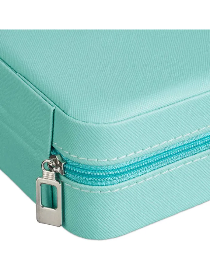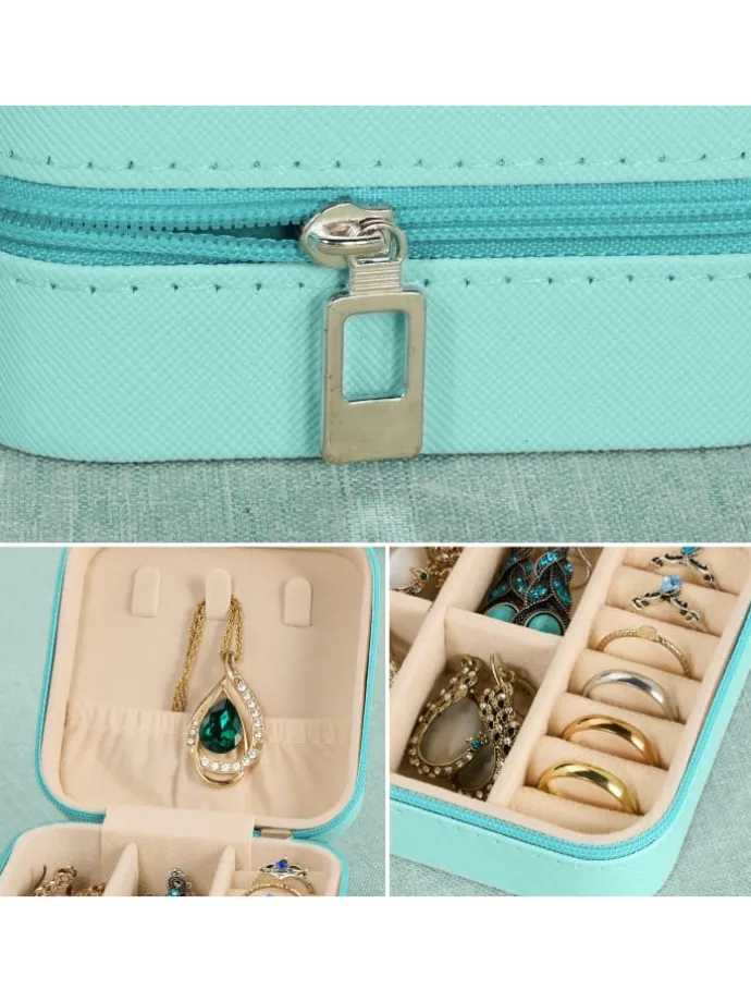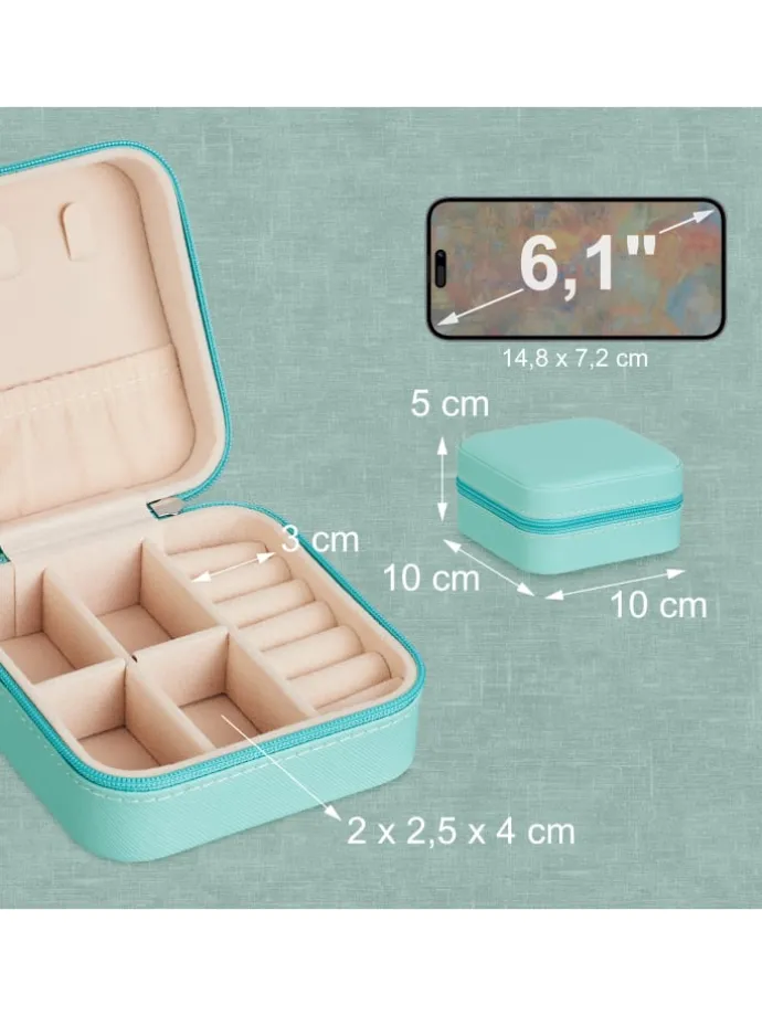 Mit diesem Schmuck-Organizer bewahrst Du Deine liebsten Schmuckstücke geordnet und übersichtlich auf, sowohl zu Hause, als auch auf Deiner nächsten Reise. Dank der kompakten Größe kann die Schmucktasche überall hin mitgenommen werden, während gleichzeitig ausreichend Platz für Ringe, Ketten, Ohrstecker und mehr geboten wird. Auch auf der Kommode überzeugt die Schmuckaufbewahrung durch schlichtes Design und Lederoptik. Der weiche Bezug schützt Deine Schmuckstücke dabei zuverlässig vor Kratzern.