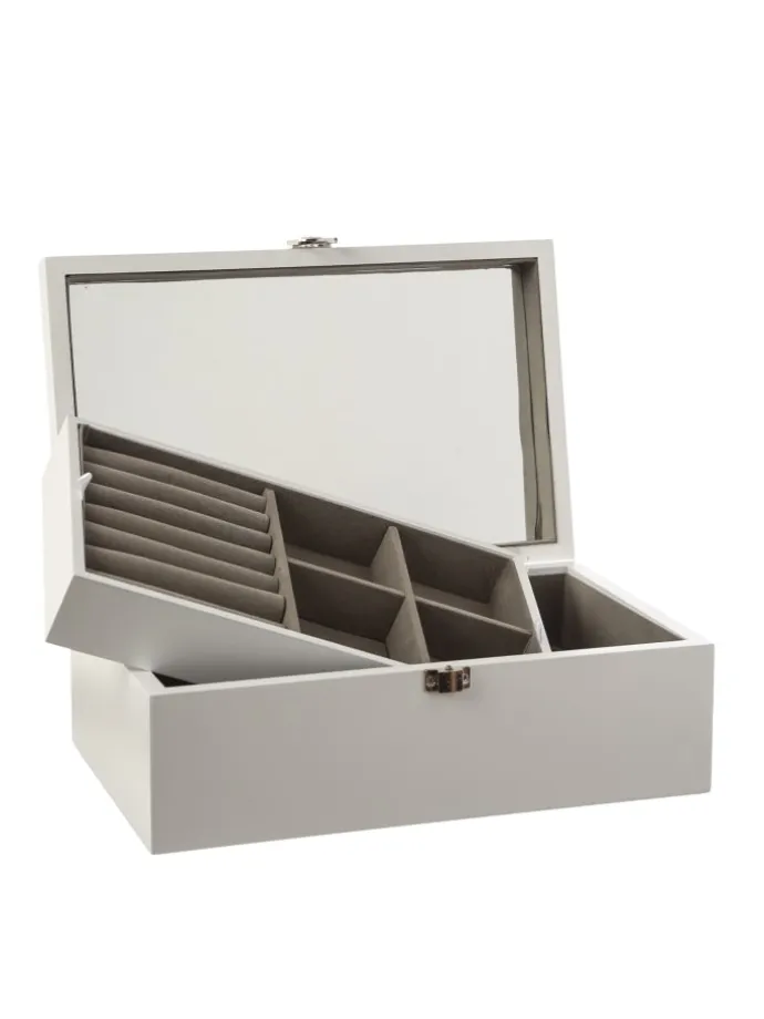 Die Möglichkeit, das Fach herauszunehmen, ermöglicht dir eine individuelle Organisation deiner Sammlung. Das Kästchen aus weiß lackiertem Holz strahlt zeitlose Eleganz aus und wird mit einem silbernen Schnappverschluss gesichert. Durch den integrierten Spiegel im Deckel kannst Du Deinen Schmuck direkt am Hals oder Ohr betrachten und Dir Dein Lieblingsstück für den Tag aussuchen.