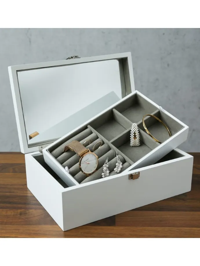 Schmuckkästchen weiß mit Spiegel und herausnehmbaren Fach Entdecke das perfekte Zuhause für deine wertvollen Schmuckstücke – unser weißes Schmuckkästchen mit Spiegel und herausnehmbarem Fach. Es bietet schützende, weiche Einlagen, die deinen Schmuck, deine Uhren, Ringe, Ohrringe, Armreife und Broschen sicher aufbewahren.