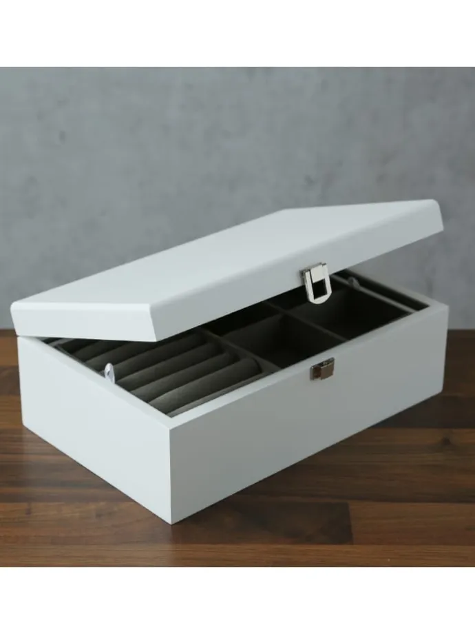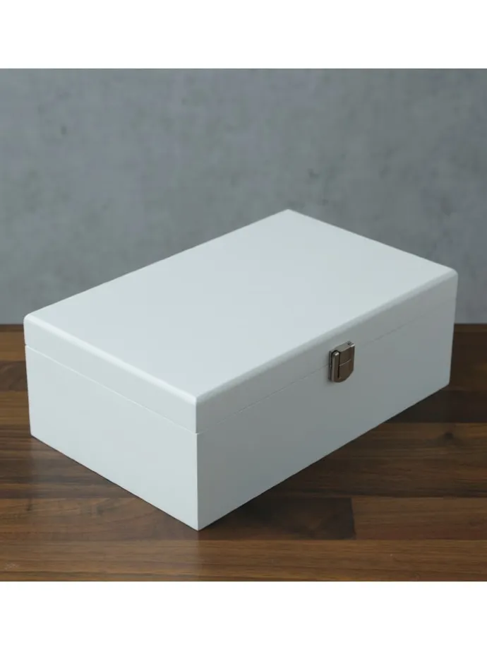 Mit Abmessungen von 25,5 x 16,5 x 9 cm bietet dieses Kästchen aus hochwertigem MDF-Material ausreichend Platz. Die matte, weiße Oberfläche verleiht ihm eine schlichte und dennoch stilvolle Ausstrahlung, die in jeden Raum passt. Organisiere und bewahre deine Schätze sicher auf – bestelle heute noch dieses weiße Schmuckkästchen, um Ordnung und Eleganz in dein Schmuckarrangement zu bringen.