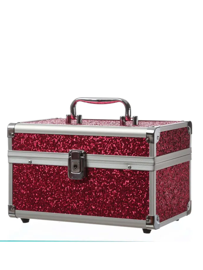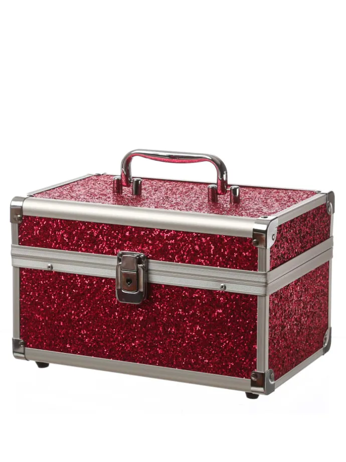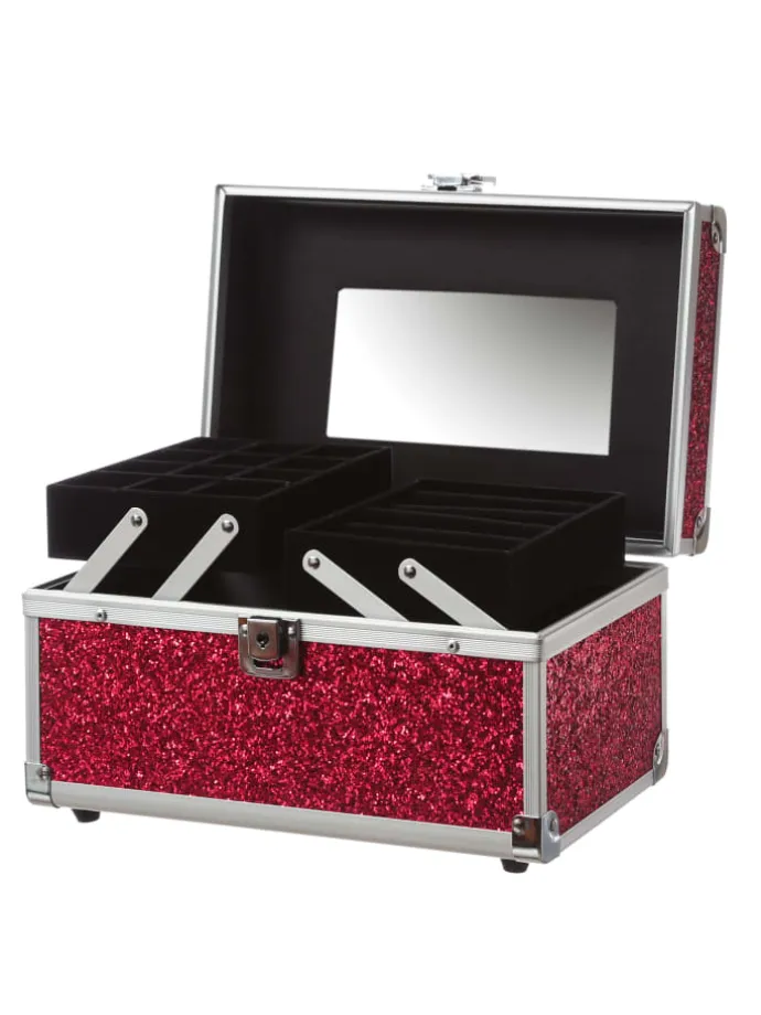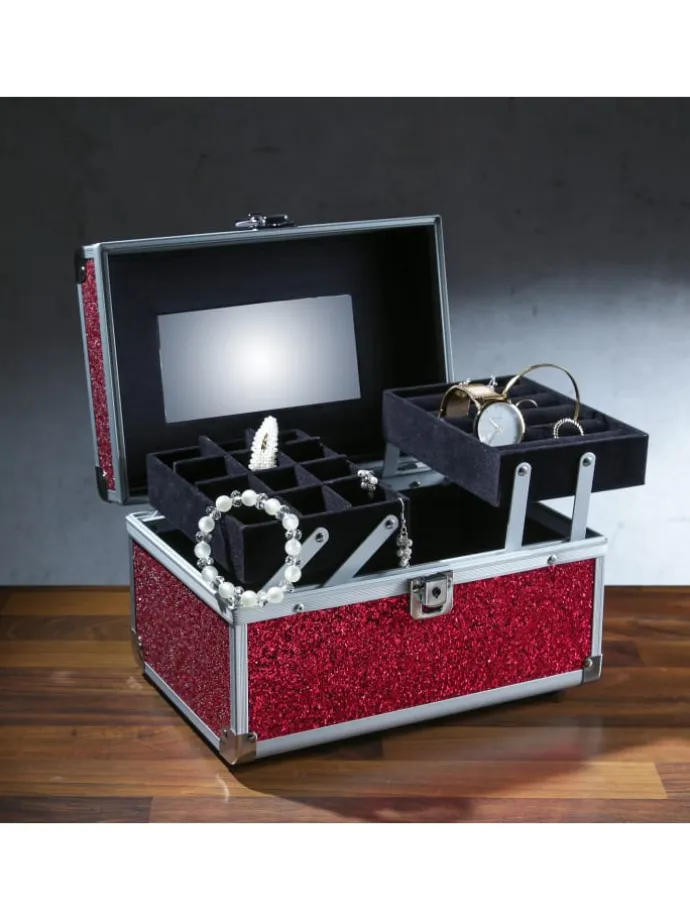 MARELIDA® Schmuckkoffer in Rot mit Glitzeroptik – Premium Schmuckkästchen für Schmuck & Co. Das glitzernde Schluckkästchen hat Platz für all die Kostbarkeiten, die Du gerne hast. Die ausklappbaren Seitenteile haben kleine und große Fächer für Ketten, Ohrringe, Ringe oder Broschen. Im Deckel befindet sich ein Schminkspiegel und im Bauch kannst Du auch größere Dinge wie einen Haarreif, Deine Sonnenbrille oder eine Bürste unterbringen.