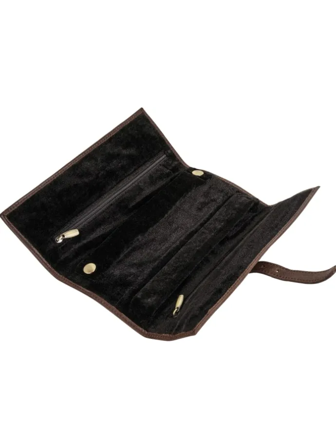 Mit der Leder Schmuckrolle von bruno banani haben Sie unterwegs stets Ihre Kostbarkeiten dabei! Verwahren Sie gut geschützt Ohrringe, Ketten und mehr in zwei Reißverschlussfächer. Im Hauptfach finden Sie außerdem zwei abnehmbare Einsätze, an denen Sie Ihre Ringe, Armbänder und Armbanduhren befestigen können. Der charmante Vintage-Look des Leders und das samtige Innenfutter sorgen für eine elegante Erscheinung.