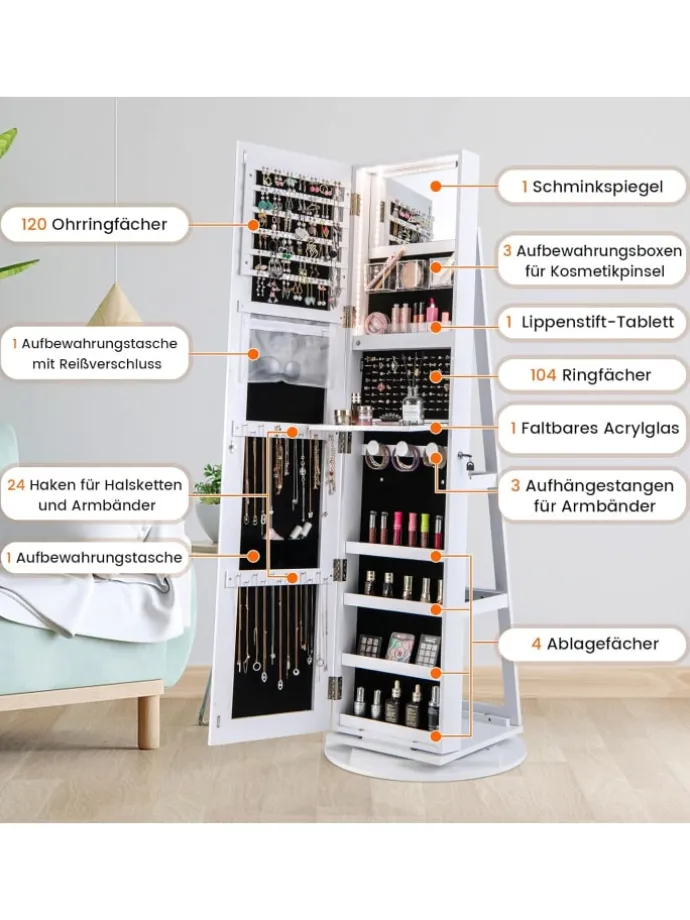 Mit dem äußeren Ganzkörperspiegel und dem kleinen Innenspiegel können Sie Ihr Outfit und Make-up bequem überprüfen. Dieser schrank verfügt über einen dreifarbigen LED-Lichtstreifen, damit Ihr glänzt und leichter zu finden ist. Das flexible, um 360 Grad drehbare Design und die hinteren Ablagefächer können Ihren unterschiedlichen Anforderungen gerecht werden und die Raumnutzung optimieren. Zusätzlich ist unser verspiegelter schrank mit 2 Schlüsseln abschließbar. Wie sie sehen, lohnt es sich, den Kauf dieses schranks in Betracht zu ziehen.