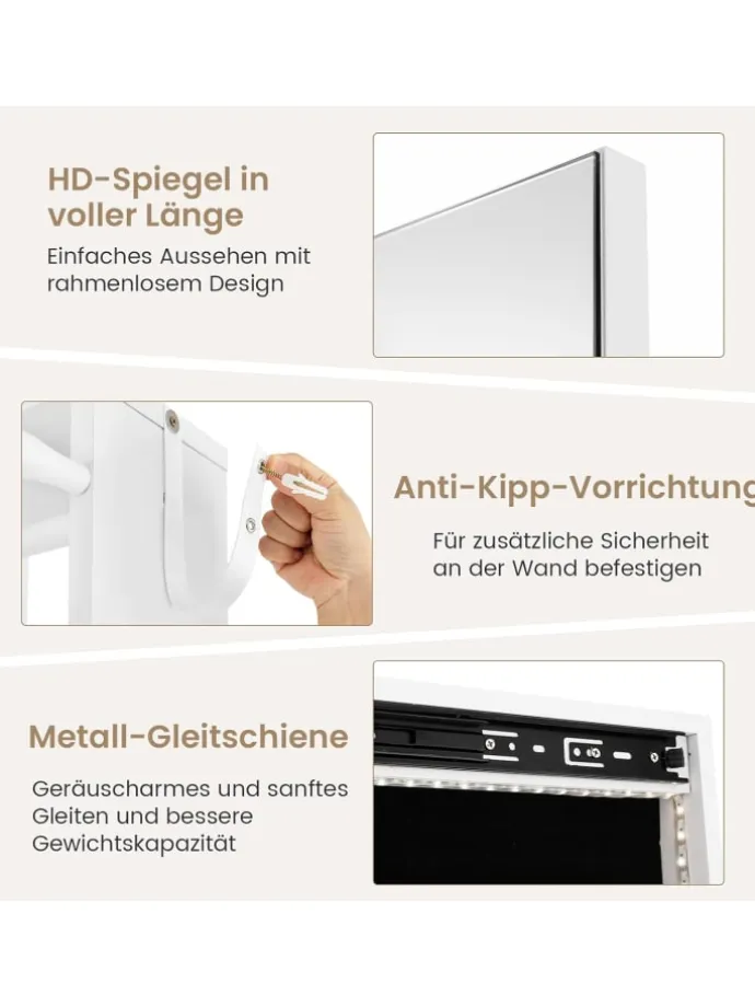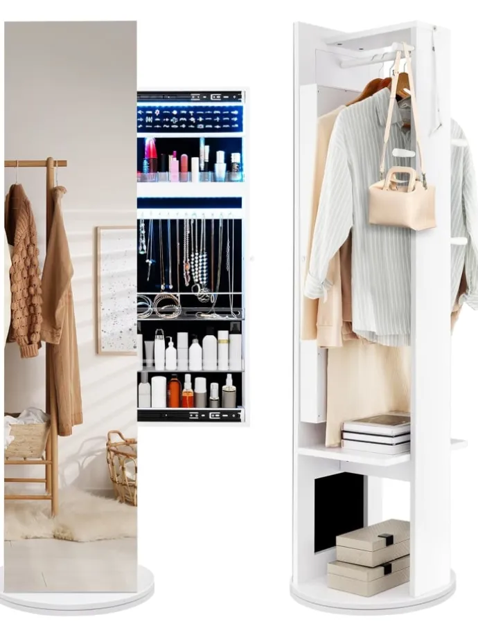 Kombiniert einen Ganzkörperspiegel, einen Schmuckschrank und eine Garderobe in einem