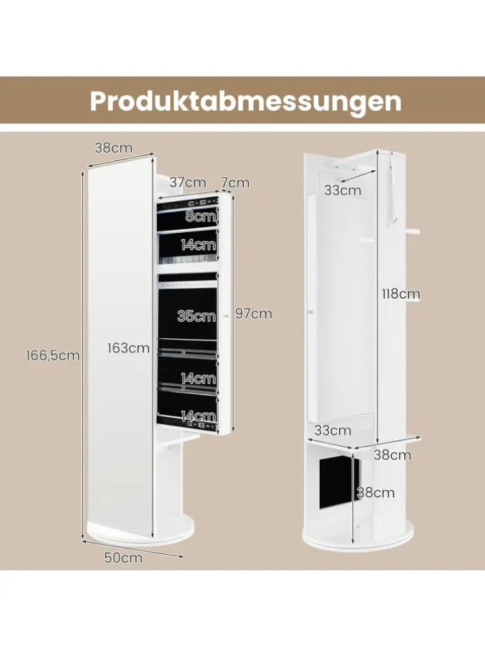 Dieser stehende Schmuckschrank mit drehbarem Sockel nimmt wenig Platz ein und bietet viel Stauraum. Er besteht aus einem Ganzkörperspiegel, einem Schmuckschrank und einer Garderobe und erfüllt so Ihre unterschiedlichen Aufbewahrungsbedürfnisse. Der Innenraum des Schmuckschranks ist mit Schlitzen, Haken, einer Aufbewahrungsbox und Regalen ausgestattet, um Ihren Schmuck und Ihre Kosmetika zu ordnen. Zusätzlich erhellen die integrierten dreifarbigen LED-Leuchten Ihren Schmuck und helfen Ihnen, sich auch im Dunkeln schick zu kleiden.