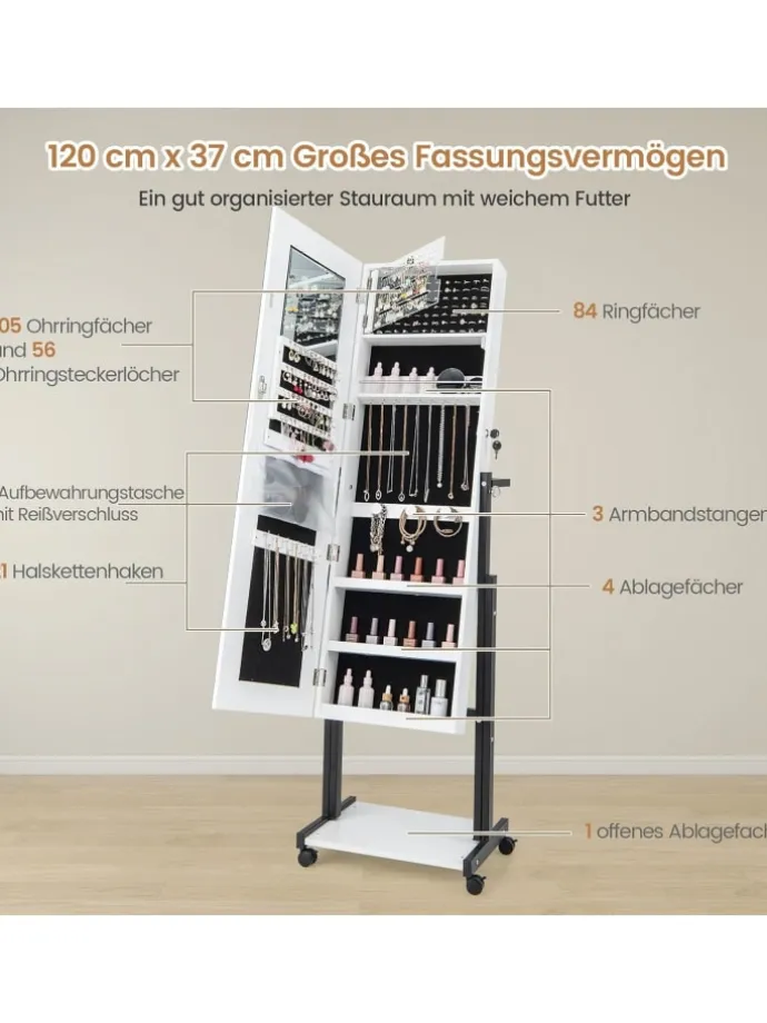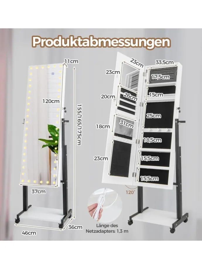 Dieser aus erstklassigen Materialien gefertigte Schmuckschrank verfügt über einen atemberaubenden Ganzkörperspiegel mit integrierten dreifarbigen LED-Leuchten. Wählen Sie zwischen warmem Gelb, kühlem Weiß oder natürlichem Licht, um die perfekte Atmosphäre für Ihre Outfits zu schaffen. Die einstellbaren Höhen und Neigungswinkel sorgen für ein individuelles und komfortables Nutzungserlebnis für Benutzer jeder Körpergröße. Mit seinem geräumigen Innenraum und den gut organisierten Fächern bietet dieser Schrank reichlich Stauraum für Ihre gesamte Schmuckkollektion. Verbessern Sie die Sicherheit Ihres Schmucks und bereichern Sie Ihren Alltag mit unserem außergewöhnlichen Schmuckständer.