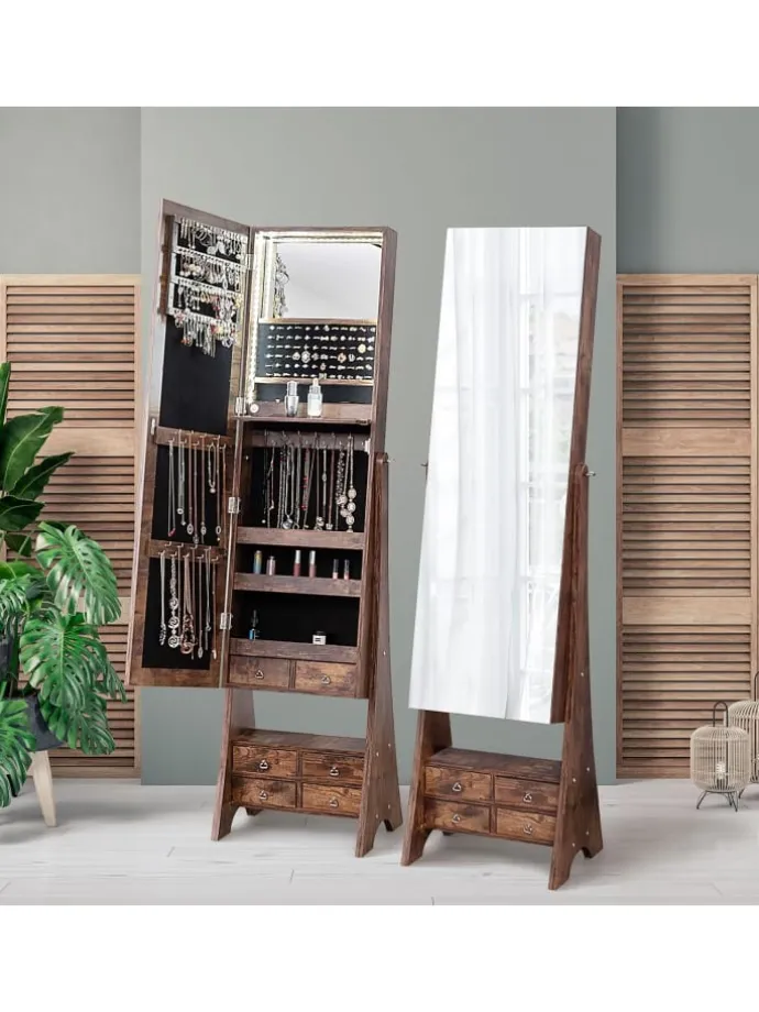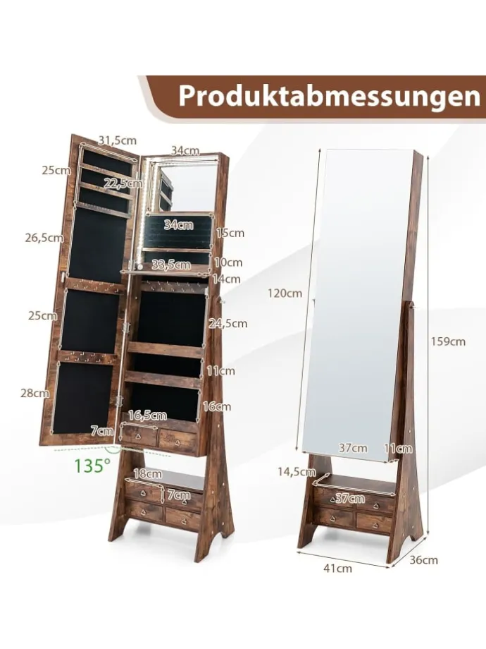 Unser freistehender Schmuckschrank bietet Ihnen eine perfekte Aufbewahrungslösung für Schmuck und Kosmetika. Dieser Schmuckständer verfügt über zwei hochauflösende Spiegel: einen Ganzkörperspiegel und einen Innenspiegel. Der Schmuckschrank lässt sich in drei Winkeln verstellen, sodass Sie den bequemsten Winkel finden. Der Innenraum ist außerdem mit automatisch eingeschalteten LED-Leuchten und einer ausklappbaren Make-up-Ablage ausgestattet, sodass Sie sich problemlos schminken können. Ausgestattet mit Schlitzen, Haken, Schubladen, Regalen und vielem mehr sind alle Ihre Schmuck- und Kosmetikartikel gut organisiert.