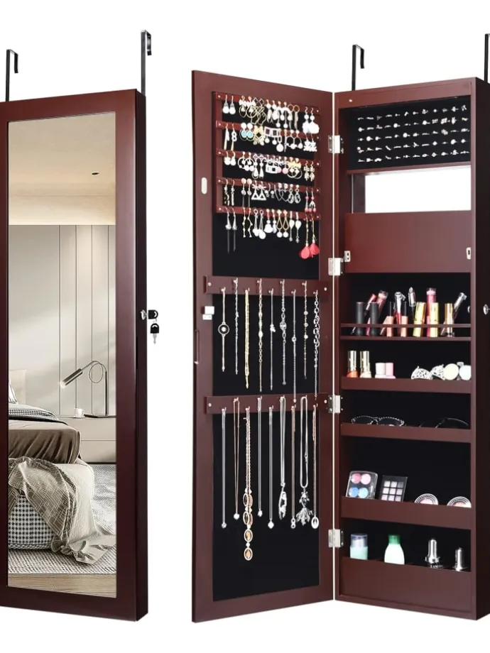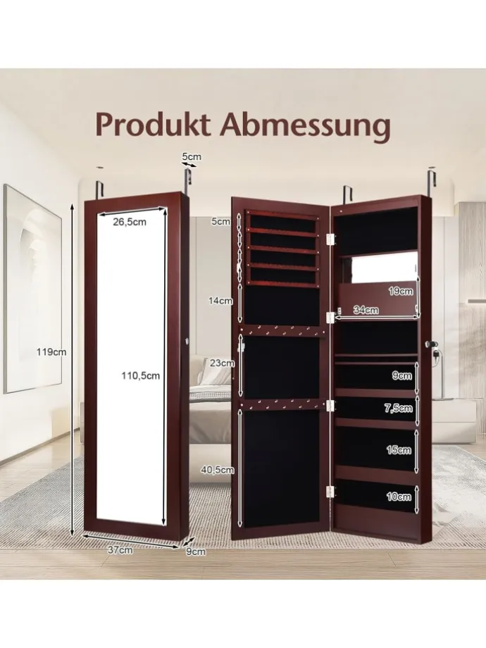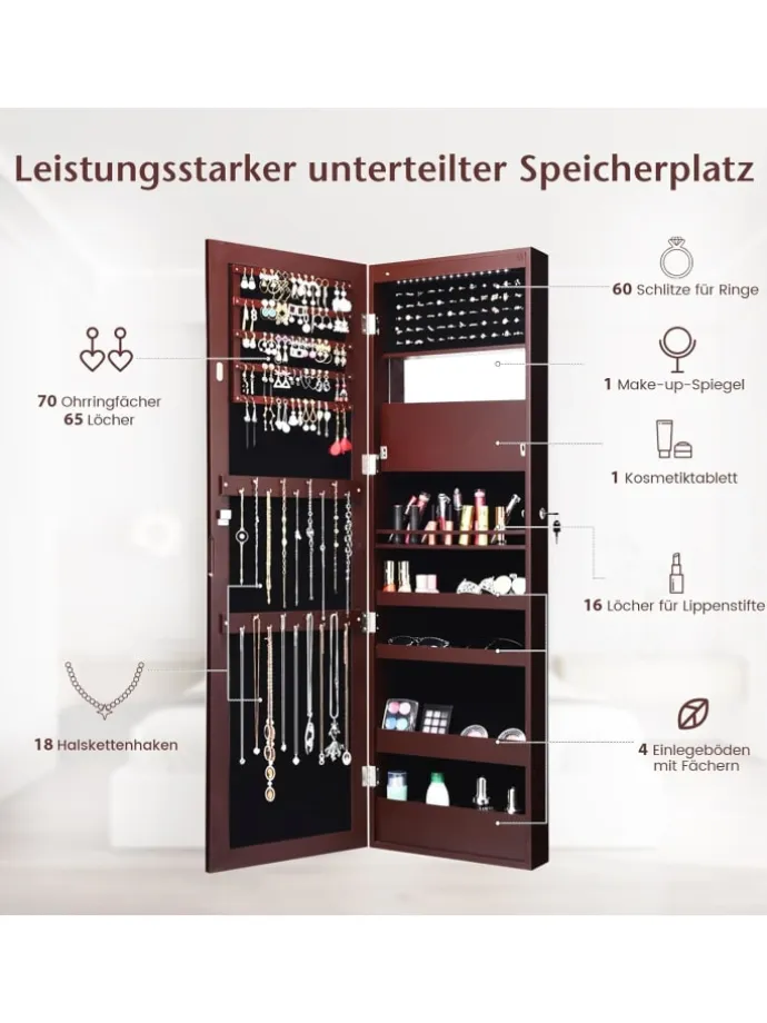 5 gefütterte Ablagen für Ohrringe, 18 Haken, 60 Ringfächer, 1 Kosmetikspiegel, 16 Lippenstiftfächer, 4 Ablagefächer