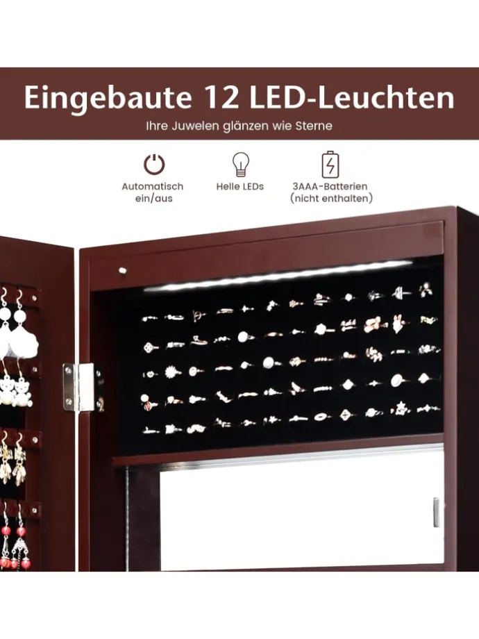 Unser LED-Schmuckschrank mit Spiegel lässt sich multifunktional mit Spiegel, Tür und LED-Licht kombinieren und wird so zu einem auffälligen Kunstwerk, das speziell für alle Ihre Wertsachen entworfen wurde! Der Schmuckschrank hilft Ihnen, Ihren Schmuck organisiert aufzubewahren und verhindert, dass er sich verheddert. Das abschließbare Design schützt Ihren Schmuck vor ungezogenen Kindern. Die eingebauten 12 LED-Leuchten sorgen für einen Hauch von Luxus und verschönern Ihren Schmuck im Schrank. Die schwarze Samteinlage schützt den Schmuck effektiv vor Kratzern und lässt sich auch leicht mit einem weichen, trockenen Tuch pflegen. Der Schmuckschrank ist praktisch zum Anprobieren Ihrer Kleidung oder Ihres Schmucks, wenn Sie einen Ausflug vorbereiten oder an einer formellen Veranstaltung teilnehmen. Außerdem passt sein schickes und elegantes Design zur Einrichtung Ihres Schlafzimmers.