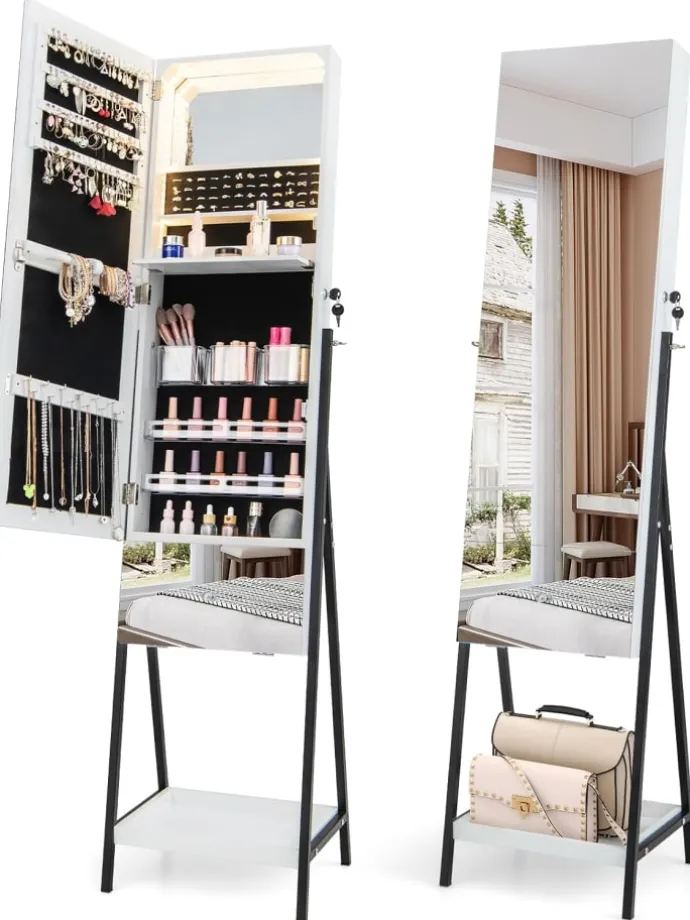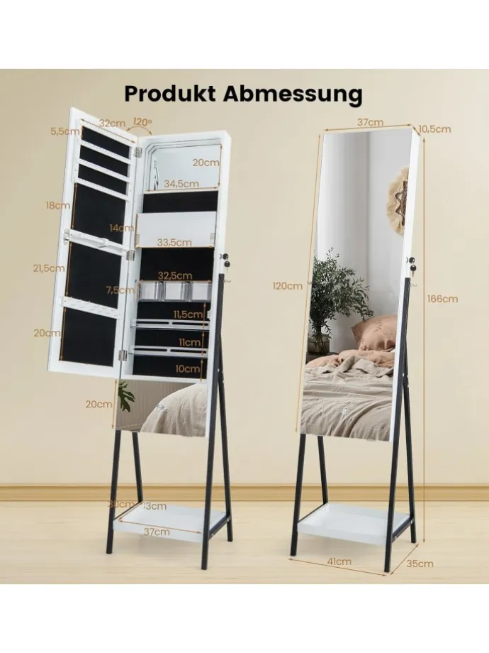 Mit seinem einzigartigen segmentierten Spiegeldesign ist dieser verspiegelte Schmuckschrank eine schöne Ergänzung für jeden Raum. Der obere Türspiegel misst 100 cm x 37 cm (L x B), während der untere Schubladenspiegel 20 cm x 37 cm (L x B) misst. Zusätzlich verfügt der Schmuckschrank über einen kleinen Spiegel im Inneren, der den perfekten Platz für Ihre tägliche Make-up-Routine bietet. Der abschließbare Schmuckschrank ist mit verschiedenen Aufbewahrungsfächern ausgestattet und hält Ihre Ringe, Ohrringe, Halsketten, Kosmetika und andere Gegenstände gut organisiert und sicher.