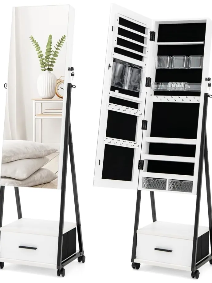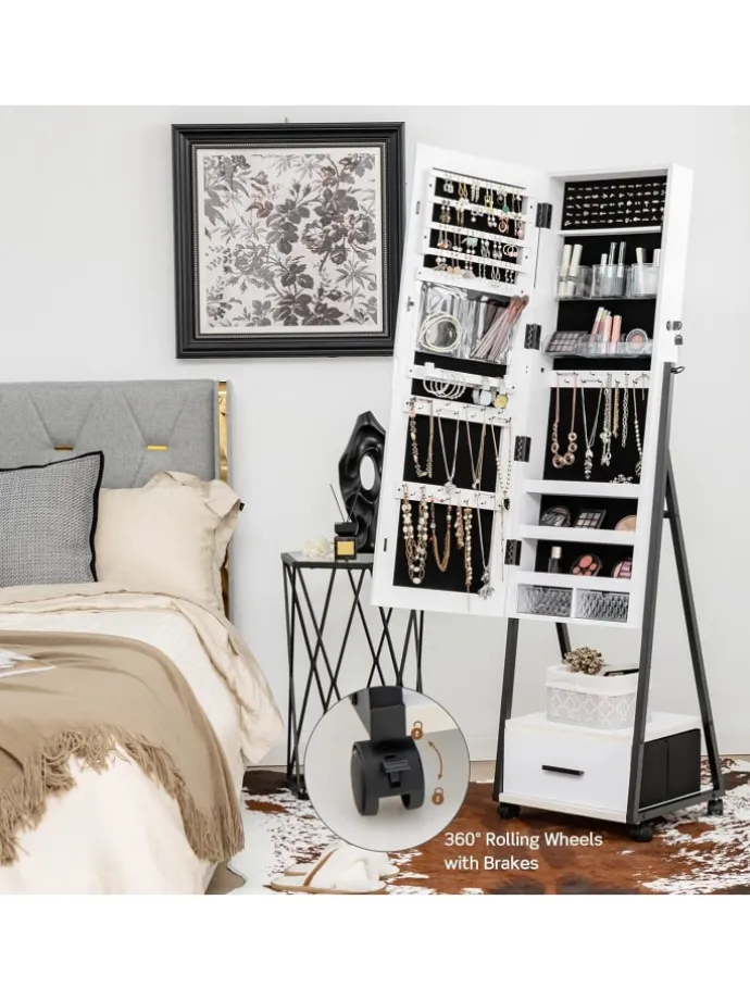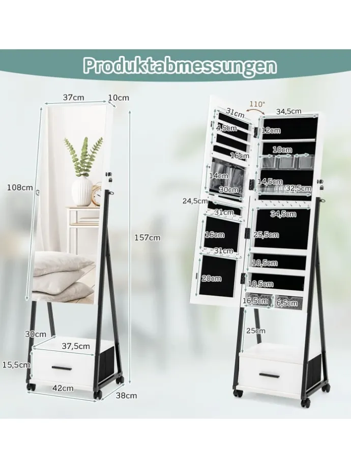 Haben Sie immer noch Probleme mit der Schmuckorganisation? Sie benötigen unseren Schmuckschrank mit Spiegel. Der Innenraum des Schmuckschranks verfügt über zahlreiche Schlitze, Fächer, Haken, Schubladen und Taschen für Schmuck und Make-up verschiedener Größen. Außerdem ist der Schmuckschrank mit einem Ganzkörperspiegel ausgestattet, der zum Anziehen und Schminken geeignet ist. Die Schranktür ist abschließbar und 2 Schlüssel sind im Paket enthalten. Die Bewegung ist mit den feststellbaren Universalrädern mühelos. Aufgrund des hochwertigem MDF-Materials und einem Metallrahmen ist die Stabilität und Haltbarkeit dieses Schmuckschranks zu jeder Zeit gewährleistet. Wenn man die Anleitung befolgt, ist auch die Montage schnell erledigt. Worauf warten Sie? Überraschen Sie noch heute ihre Frau oder Tochter.