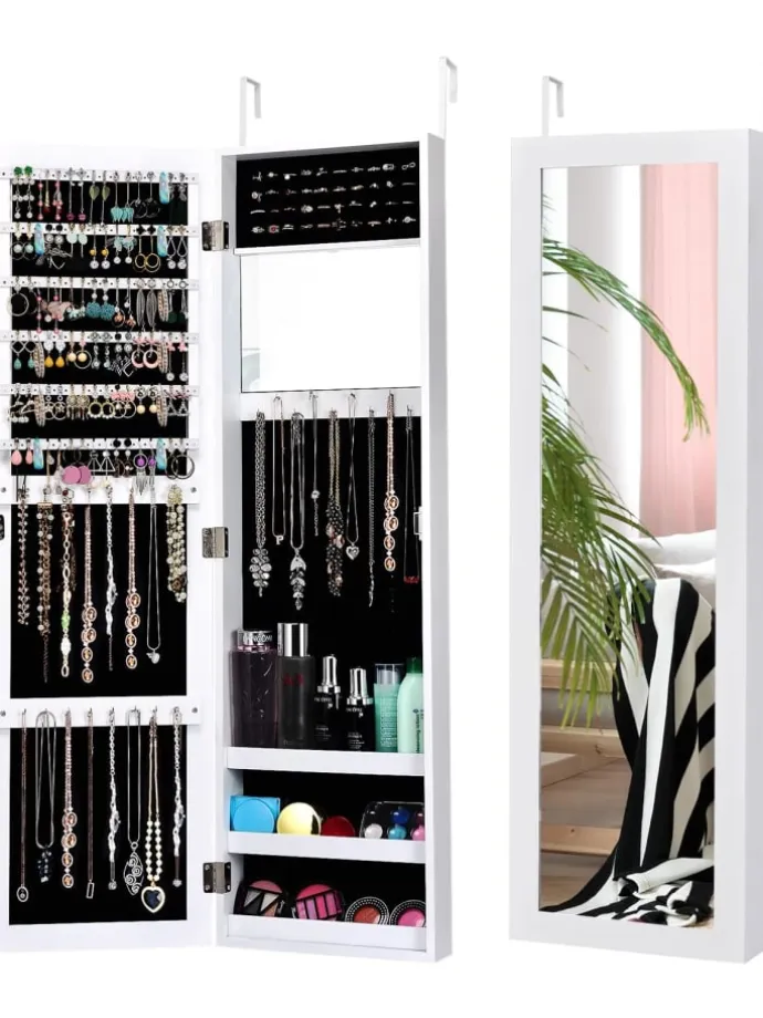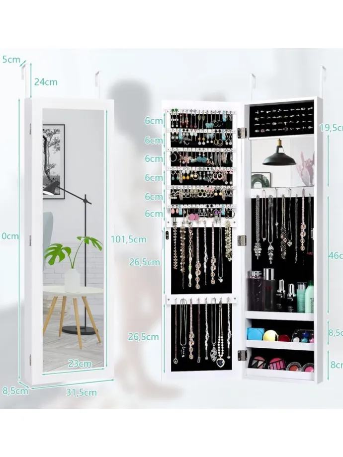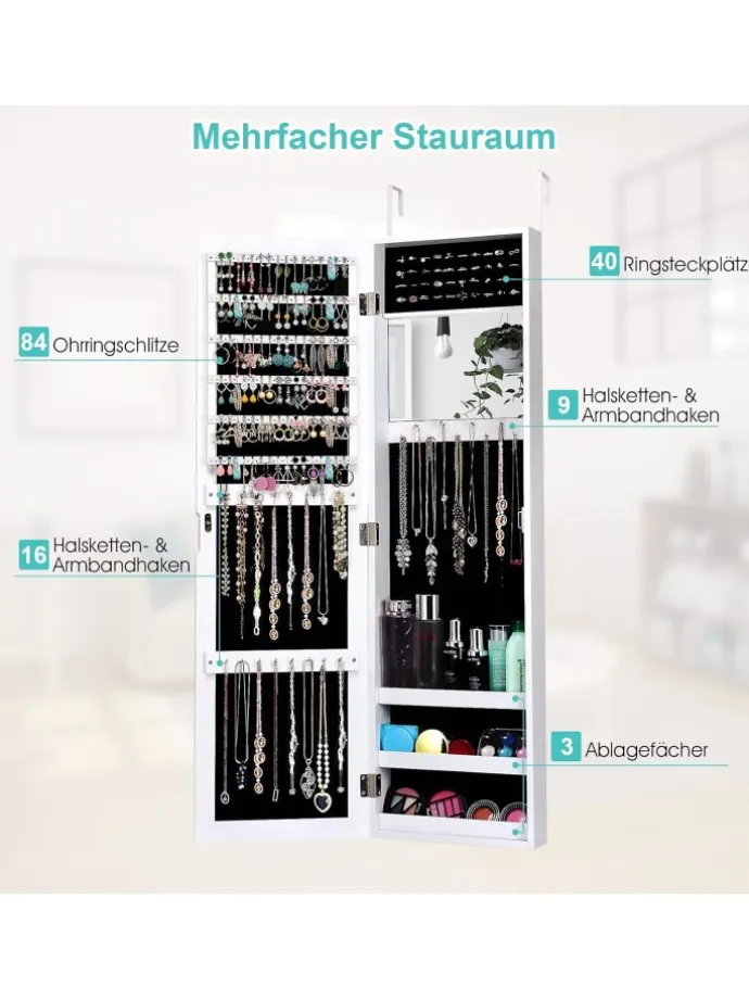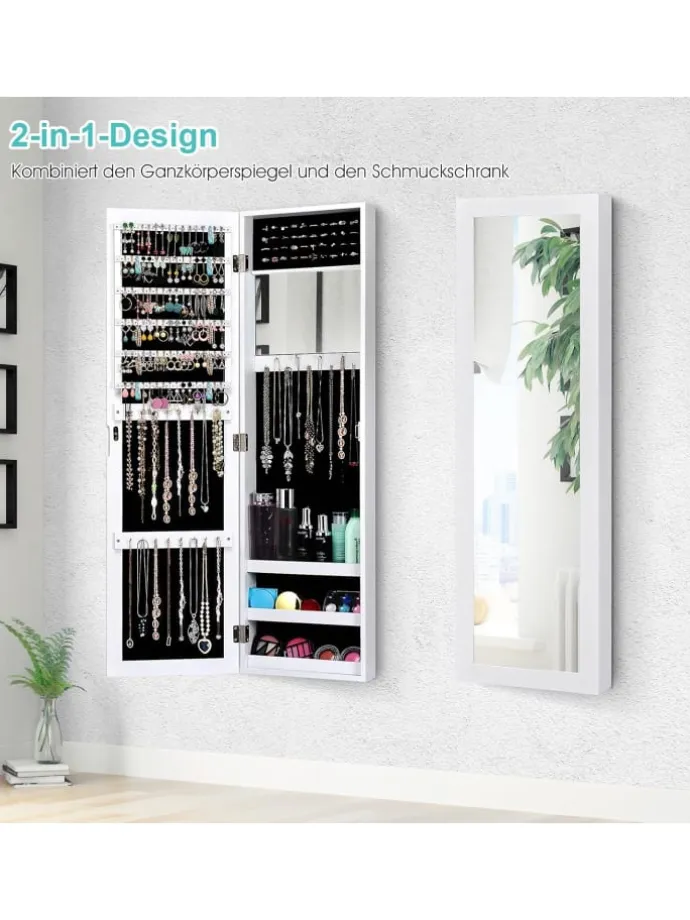 Dieser luxuriöse und funktionale 2-in-1-Spiegelschmuckschrank ist eine perfekte Ergänzung für Ihr Zuhause! Ausgestattet mit mehreren Fächern kann dieser Schmuckschrank all Ihren Schmuck und Ihre Kosmetik an einem Ort organisieren, einschließlich Halsketten, Ringe, Ohrringe, Armbänder, Sonnenbrillen, Uhren, Lippenstifte usw.