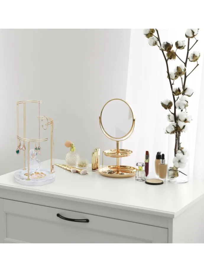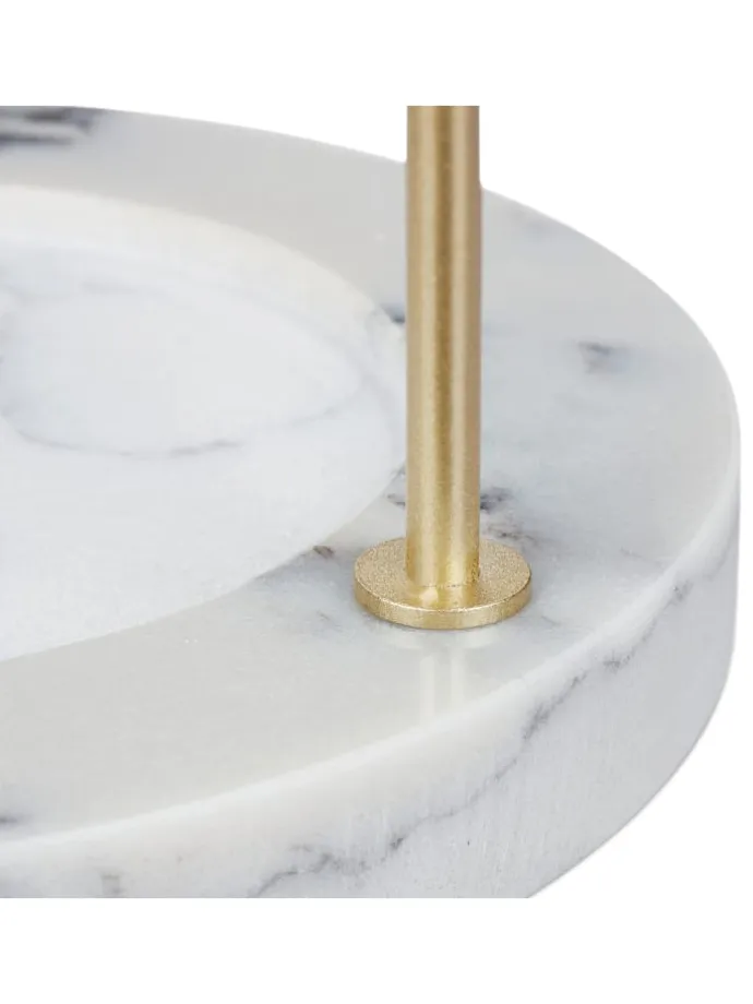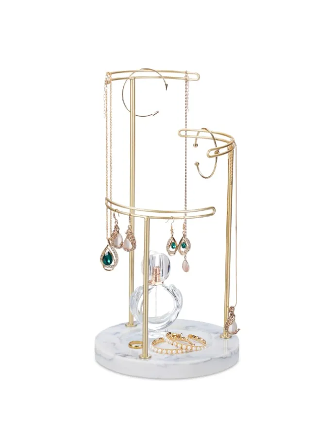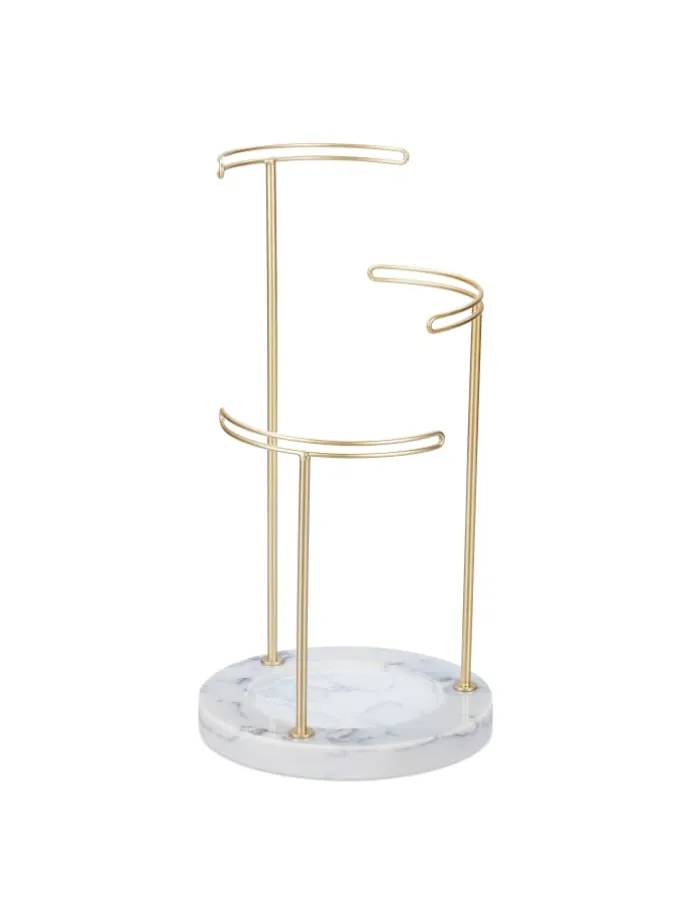 Mit diesem Schmuckständer gehören verhedderte Halsketten der Vergangenheit an. Der Kettenhalter bietet auf 3 Stangen Platz für unterschiedlich lange Halsketten. Aber auch Ohrringe, Armbänder und -reifen lassen sich übersichtlich auf der Schmuckhalterung verstauen. Dank der Kombination aus goldenen Stangen und Sockel aus Marmor wirkt der Halskettenständer besonders elegant und fügt sich dekorativ auf dem Schmink- oder Frisiertisch ein.