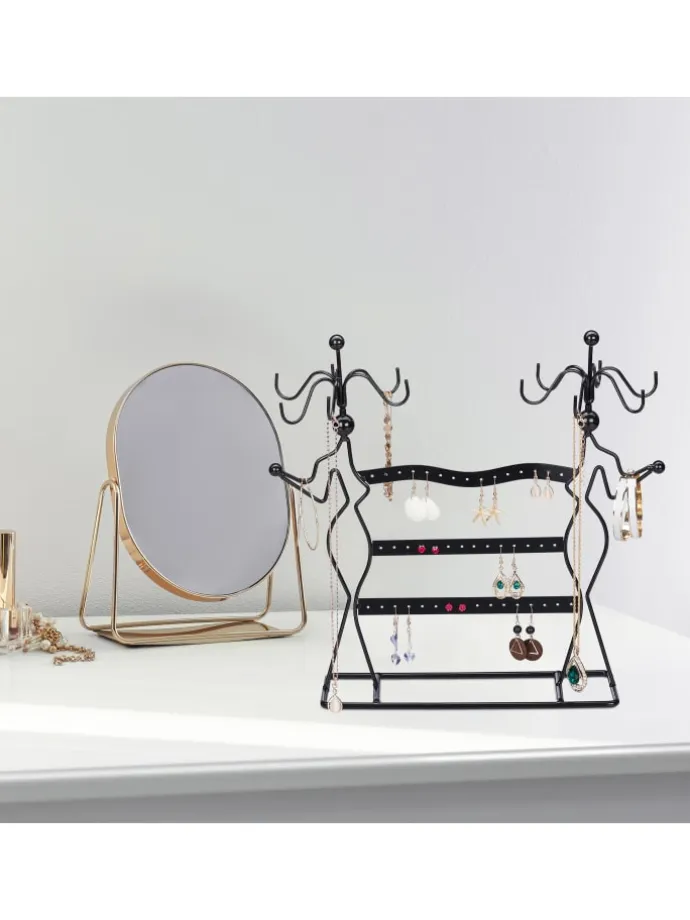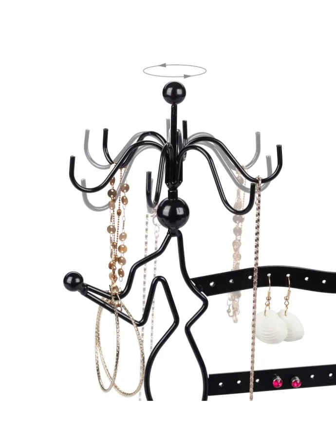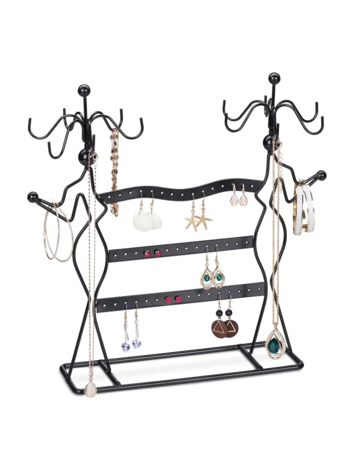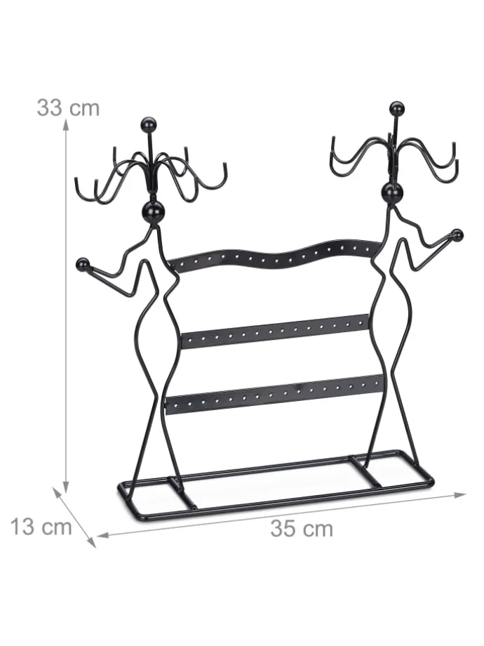 Mit diesem Schmuckständer bewahren Sie Ihre liebsten Schmuckstücke übersichtlich und geordnet auf. Der Schmuck Organizer bietet viel Platz Platz mit 45 Löchern für Ohrringe und -stecker sowie 2 Armbandhaltern. An den 12 drehbaren Kettenhaken ist Ihr Halsschmuck zudem griffbereit aufbewahrt. Platzieren Sie die Schmuckhalterung als Hingucker auf dem Schminktisch. Die weiblich geformten Figuren machen den Kettenständer dabei zu einer stylischen Präsentationsmöglichkeit für Ihren Lieblingsschmuck.