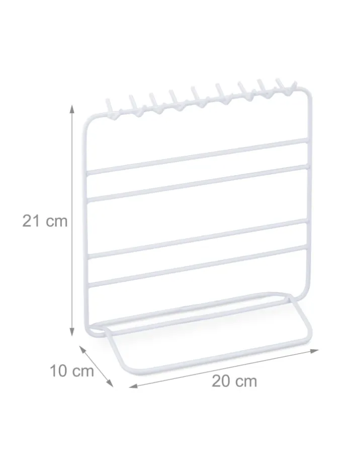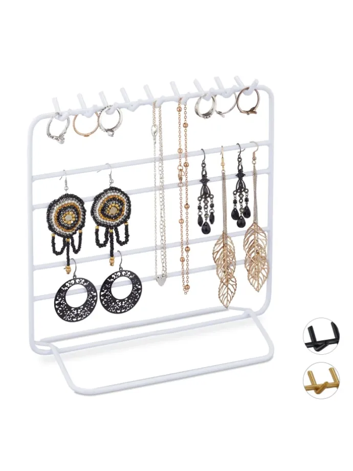 Im Bad liegt alles voller Schmuck, die Ketten sind verheddert und Sie können Ihre Lieblingsohrringe nicht finden? Dieser Schmuckständer ist die Lösung! Auf 18 Haken ist Platz für Ihre Ketten, Ringe und Armbänder und die 4 Querstangen sind ideal für die Aufbewahrung von Ohrhängern und Armbändern mit Verschluss. Doch auch Uhren oder Sonnenbrillen sind gut auf dem Schmuckhalter aufbewahrt. Durch das schlichte Design steht Ihr Schmuck im Mittelpunkt und der Kettenständer passt in jede Einrichtung.