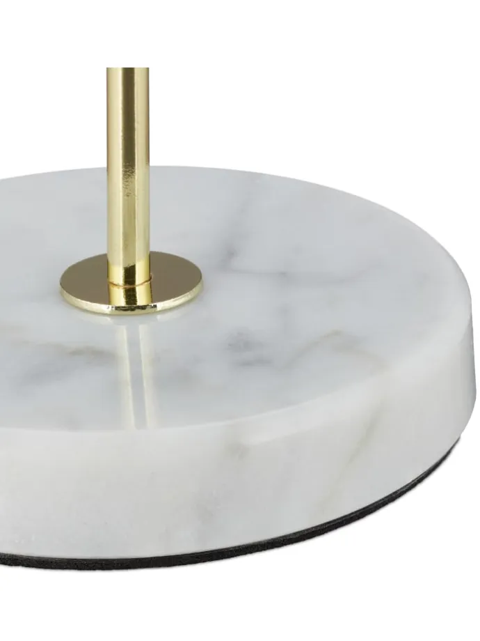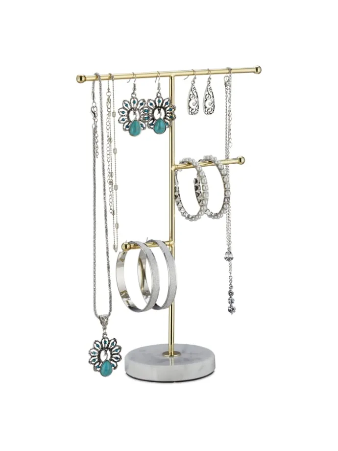 Mit diesem Schmuckhalter gehören verhedderte Halsketten der Vergangenheit an. Der Schmuckständer bietet auf drei Stangen Platz für unterschiedlich lange Ketten. Aber auch Ohrringe, Armbänder und -reifen lassen sich übersichtlich auf der Schmuckhalterung verstauen. Dank der schlichten, eleganten Optik fügt sich der Kettenorganizer hervorragend auf jedem Schminktisch ein. Besonders edel wird der Schmuckbaum durch den Sockel aus massivem weißem Marmor und den Gold glänzenden Stangen.