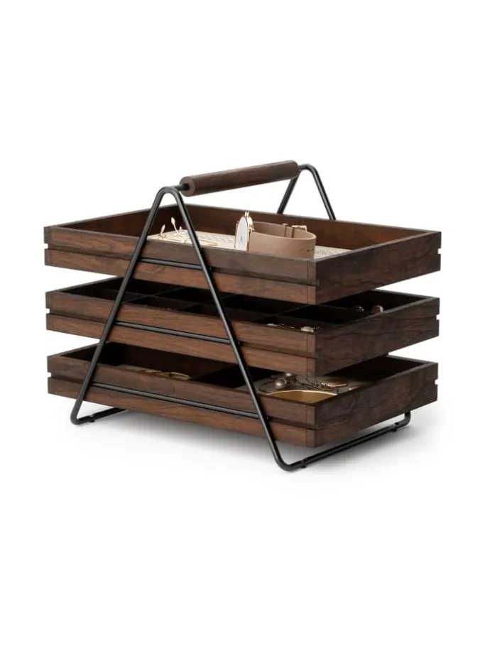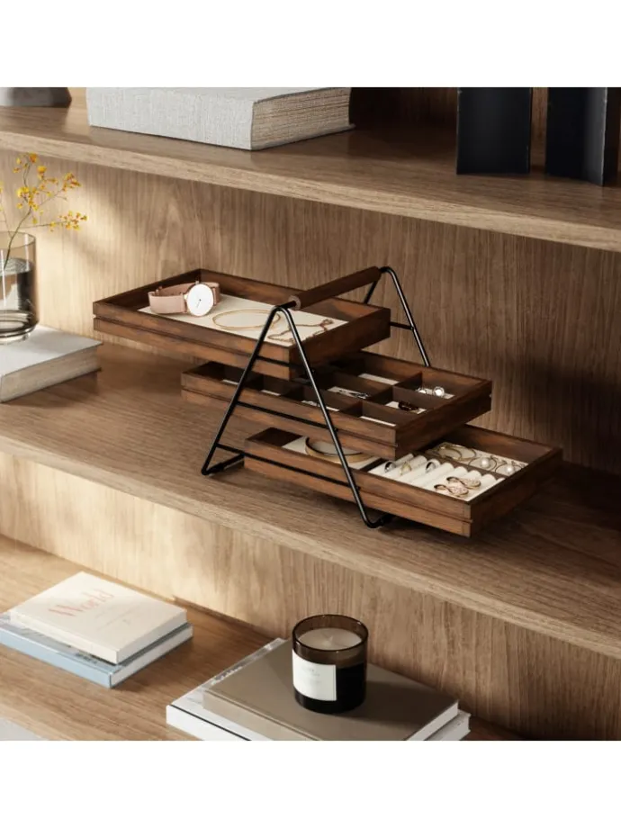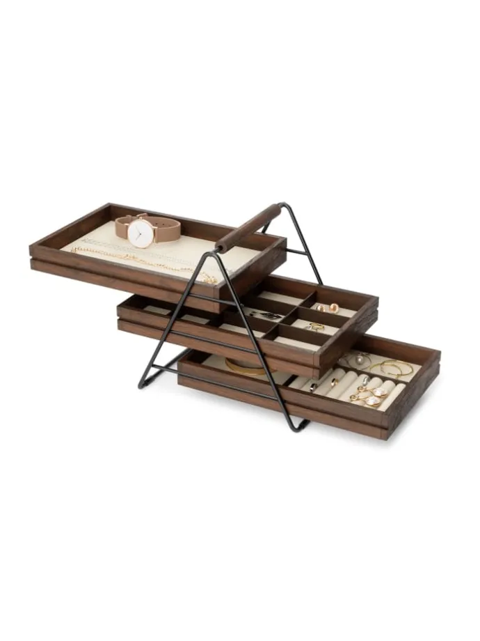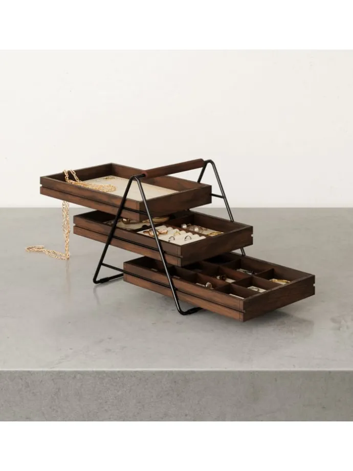 Das Terrace Schmucktablett verfügt über drei gestapelte Tabletts mit Fächern, die sich ideal für die Organisation und sichere Aufbewahrung von Schmuckstücken eignen.