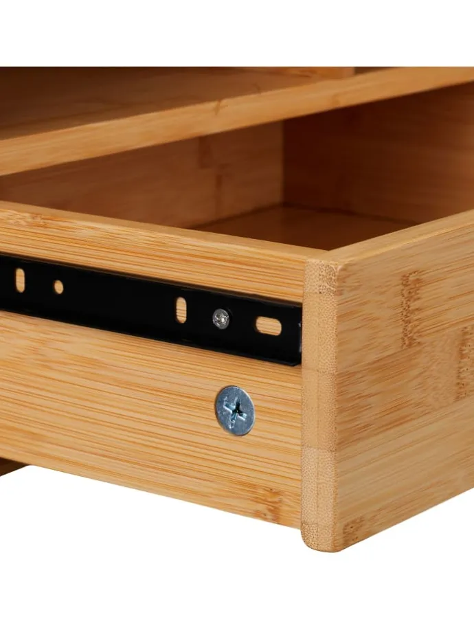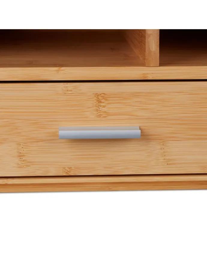 Dieser Bürotisch-Organizer sorgt für einen besseren Überblick auf Deinem Schreibtisch. Mit seinen 2 Fächern und der geräumigen Schublade bietet er viel Stauraum, um Schreibwaren oder Dokumente zu ordnen. Du kannst den Schreibtischbutler auch als Drucker-Organizer verwenden. Stelle einfach oben Deinen Drucker ab und nutze den Raum darunter sinnvoll für beispielsweise Ersatzpatronen. Die Schreibtischbox aus Bambus wirkt mit ihrer natürlichen Maserung sehr dekorativ im Büro oder Arbeitszimmer.