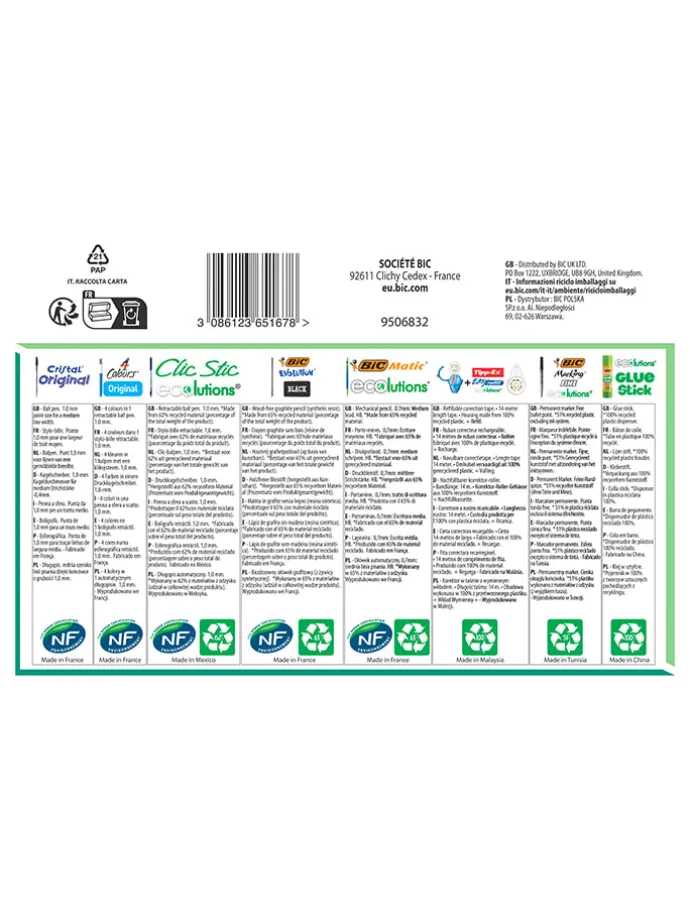 – Inhalt: Kappenkugelschreiber „Cristal“, Druckkugelschreiber „Clic Stic ECOlutions“, Vierfarb-Druckkugelschreiber „4 Colours“, Bleistift „ECOlutions“, Druckbleistift „Matic ECOlutions“, Permanentmarker „Fine ECOlutions“, Klebstift „Glue Stic ECOlutions“, Tipp-Ex „Easy Refill“, Tipp-Ex-Nachfüller „Easy Refill“