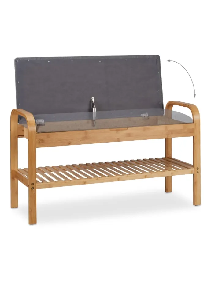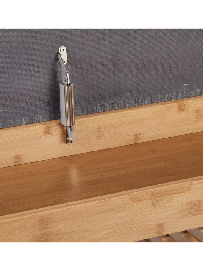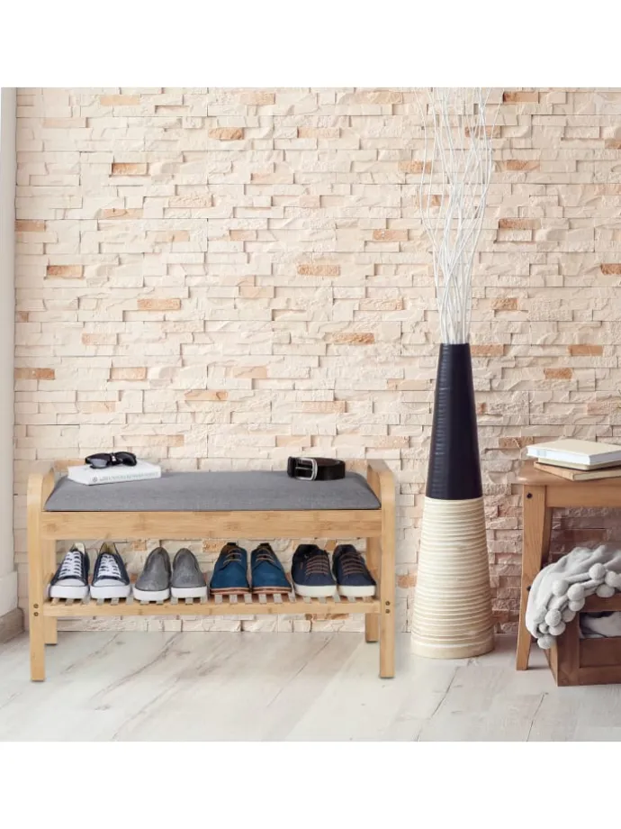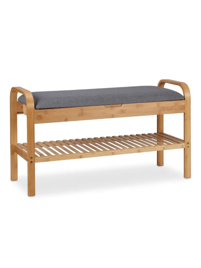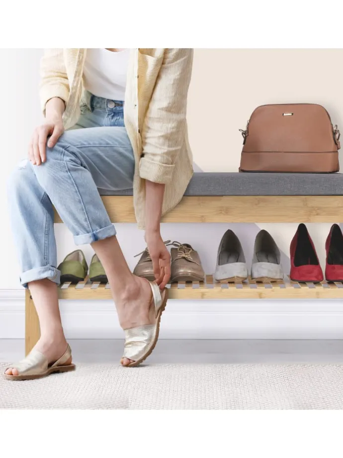 Dieses Schuhregal aus Bambus setzt natürliche Akzente in der Garderobe und bietet Platz für 4 Paar Deiner Lieblingsschuhe. Nach einem langen Tag kannst Du auf der gepolsterten Sitzfläche bequem aus den Schuhen schlüpfen. Dank des offenen Designs hast Du das passende Paar beim Zusammenstellen Deines Outfits jederzeit griffbereit. Zudem befindet sich unter dem Sitzpolster der Schuhbank ein praktisches Innenfach, in dem Tücher, Handschuhe oder auch Schuhpflege und -sohlen verstaut werden können.