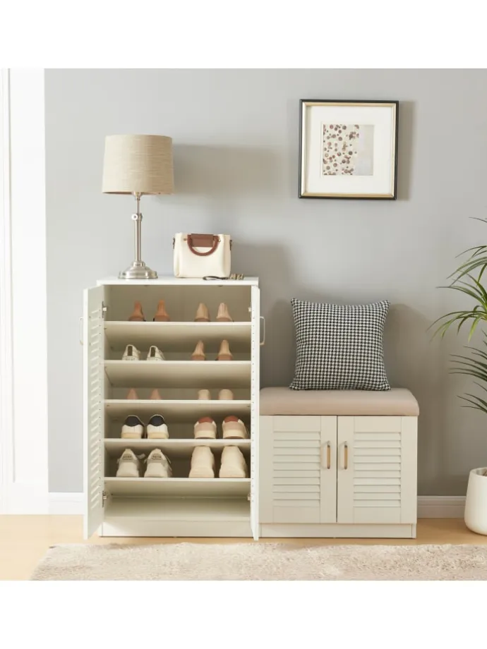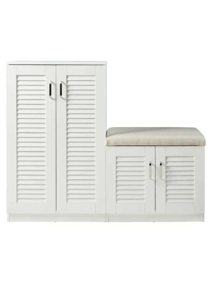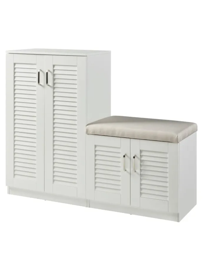 Der Schrank bietet nicht nur einen großzügigen Stauraum für Ihre Schuhkollektion, sondern verfügt auch über eine integrierte Sitzbank, die das bequeme An- und Ausziehen Ihrer Schuhe ermöglicht.