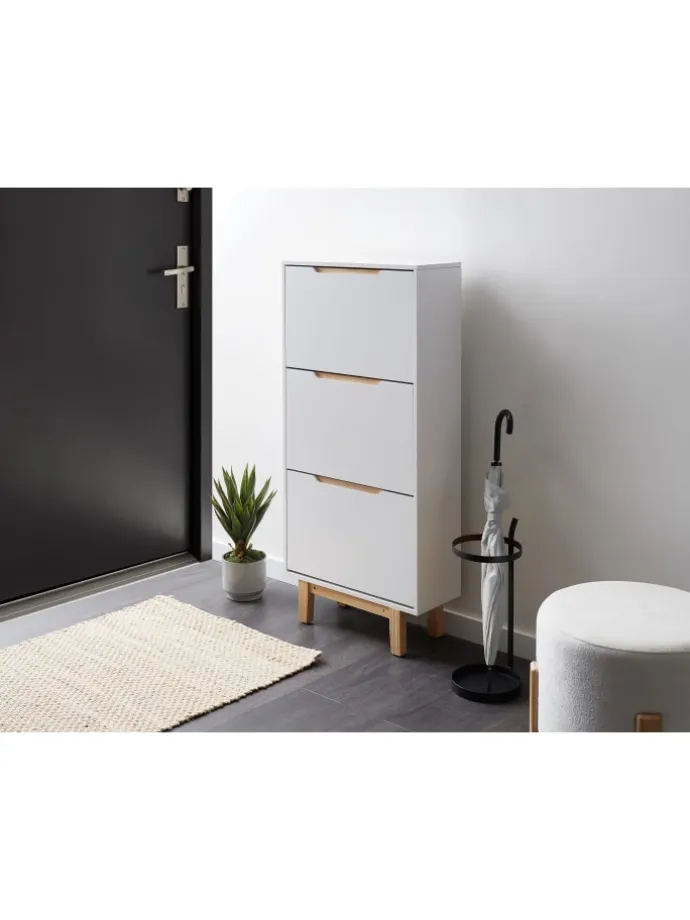 Hoher, moderner Schuhkipper mit 3 Klappen. Diese geräumige Schuhkommode ist mit 3 praktischen Kippfächern ausgestattet, die Ihnen helfen, für Struktur und Ordnung in Ihrem Eingangsbereich zu sorgen. Der Schuhschrank zeichnet sich durch seine kompakte, klare Silhouette, geschlossene Fronten und seine stabilen Holzfüße aus. Die Griffmulden der Klappfächer greifen den hellen Farbton der Holzbeine auf und verleihen den sonst weißen Oberflächen des Schuhkippers einen besonderen Touch.
