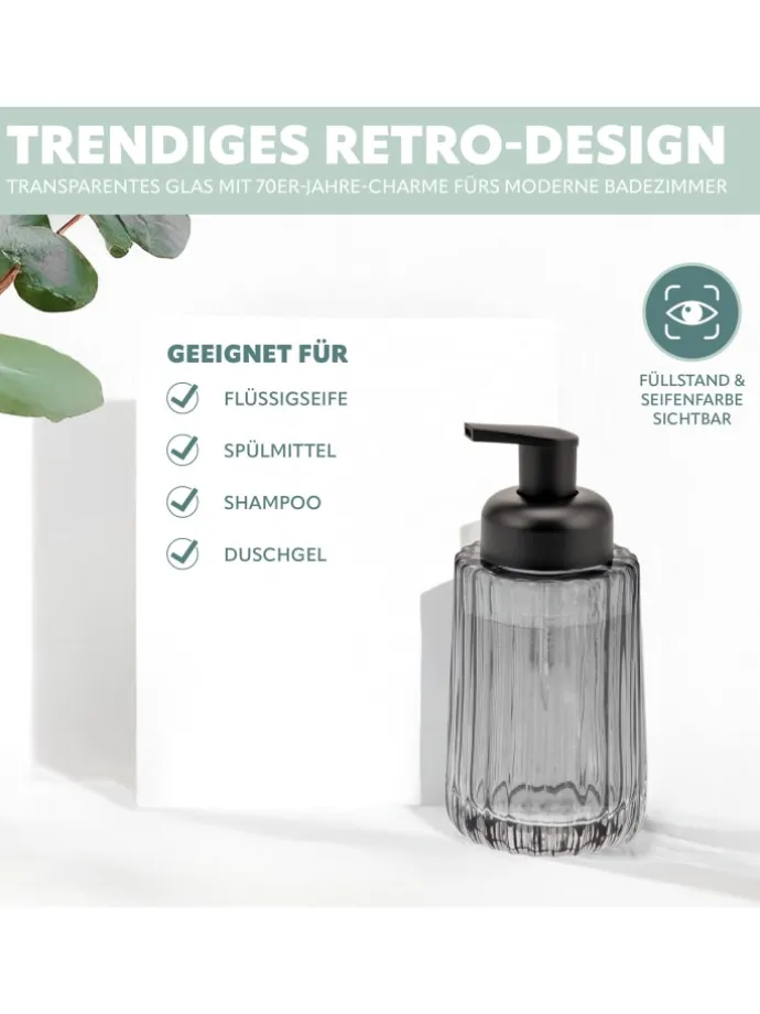 Mit Ihrem neuen Seifenspender aus grau-transparentem Glas liegen Sie genau richtig. Dieses Rauchglas war in den 70ern top-modern. Heute lebt dieser Trend wieder auf und ist ein Must-Have in jeder modernen Wohnung.