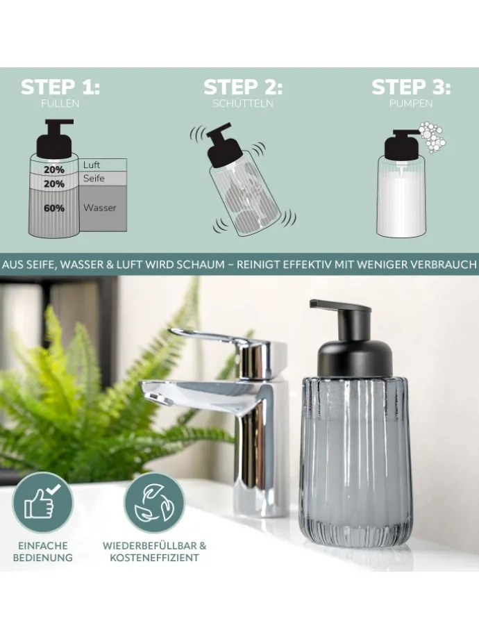 Ihr neuer Spender für Seife verwandelt Ihre ganz normale flüssige Seife in zarten Schaum. Dafür müssen Sie nur etwas Seife (20%) mit viel Wasser (60%) verdünnen und etwas Luft (20%) im Spender belassen. Wenn Sie dann den Pumpkopf betätigen, erhalten Sie leichten Schaum statt dickflüssiger Seife. Dieser lässt sich besonders gut in den Händen verteilen. Kindern macht das ganz sicher Spaß. Händewaschen wird so aber auch für Erwachsene zum angenehmen Vergnügen. Sie sparen viel Seife und das dazugehörige Verpackungsmaterial. So sparsam, umweltbewusst – Ihr neuer Schaum-Seifenspender kann viel mehr als Sie auf den ersten Blick vermuten!