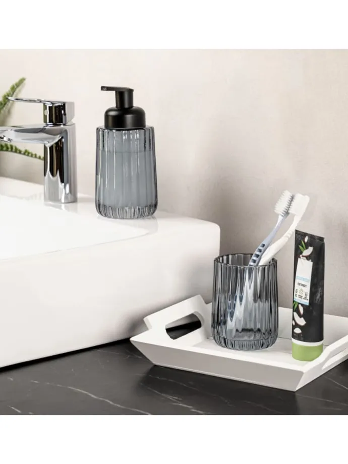Ihr neuer Seifenspender ist Teil einer Design-Serie. Mit trendigem Rauchglas-Design können Sie so Ihr Bad mit gleich mehreren tollen Eyecatchern ausstatten. Zur Serie gehören eine Seifenschale (Art. Nr.: 93065), ein Zahnputzbecher (Art. Nr.:93067) und eine WC-Garnitur (Art. Nr.:93068).