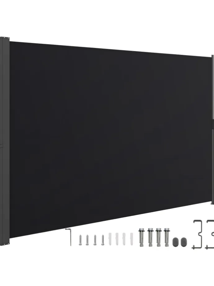 Die einziehbare Seitenmarkise besteht aus einem hochwertigen Polyestergewebe, das nicht nur sonnenbeständig, sondern auch verschleißfest ist. Ausgestattet mit einem 1 m langen Aluminiumgestänge, das eine Neigung von 2° aufweist, sorgt die aufrollbare äußere Trennwand dafür, dass das Markisentuch flach und dicht ist. Dank des federbelasteten Griffs lässt sich der äußere Sichtschutz leicht öffnen oder einfahren. Darüber hinaus ermöglicht die Wandmontage eine einfache Installation. Die faltbare Seitenmarkise wird mit 4 Spreizschrauben geliefert und kann so an einer Vielzahl von Oberflächen befestigt werden.