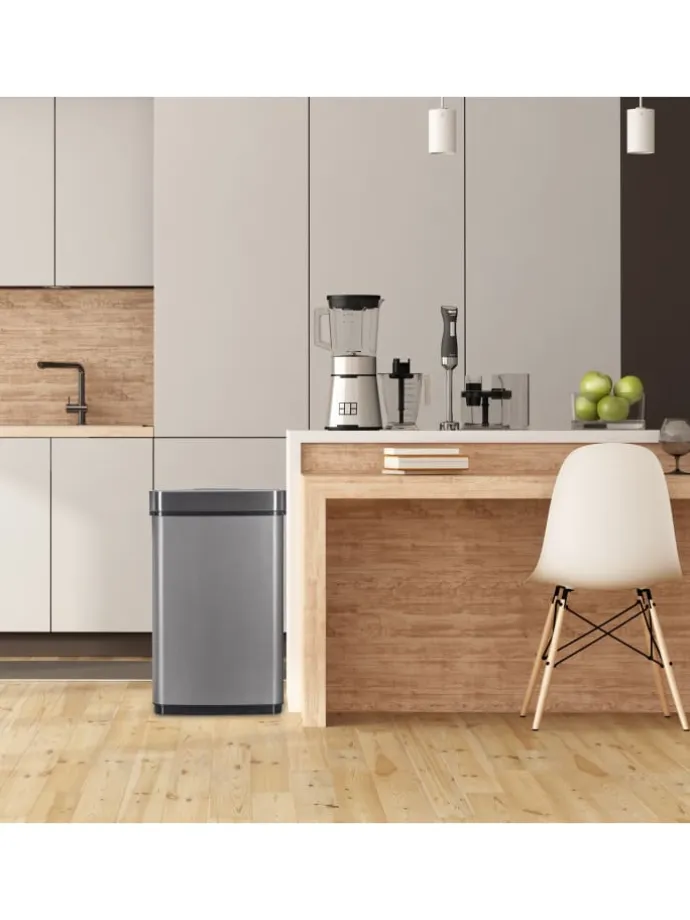 Der Mülleimer mit Sensor macht die Abfallaufbewahrung im Haushalt um einiges leichter. Sie müssen den Abfalleimer aus Edelstahl nicht berühren, damit sich sein Deckel öffnet. Dazu genügt schon eine Handbewegung. Nach rund 5 Sekunden schließt sich der Deckel von selbst wieder. Die manuelle Bedienung per Knopfdruck ist genauso möglich. Der Deckel schirmt neugierige Blicke ab und fügt sich seinerseits dank seiner hochwertigen Optik stark ein.