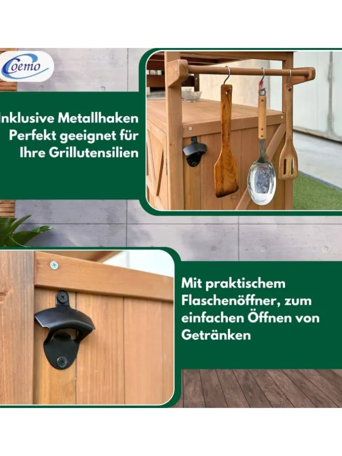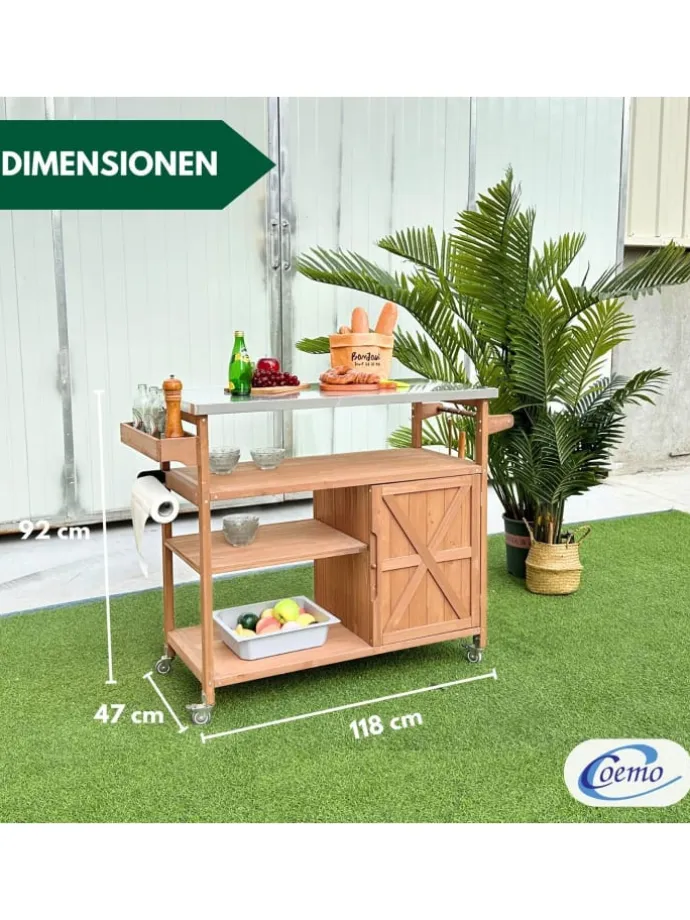 Der Coemo Servierwagen James ist ein vielseitiger Begleiter für Garten, Terrasse, Balkon oder Küche und macht das Kochen, Grillen und Servieren spürbar komfortabler. Er bietet ausreichend Platz für Geschirr, Getränke, Zutaten oder Grillzubehör und hilft dabei, alles ordentlich und griffbereit zu organisieren. Die Arbeitsfläche aus Edelstahl ist robust, pflegeleicht und ideal für den täglichen Einsatz geeignet – sowohl drinnen als auch draußen. Sie eignet sich perfekt zum Vorbereiten von Speisen oder als praktische Ablage beim Grillen. Das stabile Holzgestell sorgt für einen sicheren Stand und verleiht dem Servierwagen seinen warmen, zeitlosen Landhausstil. In den zwei geschlossenen Schränken lassen sich Küchen- und Grillutensilien geschützt verstauen, während das offene Fach schnellen Zugriff auf häufig benötigte Dinge ermöglicht. Dank der leichtgängigen Rollen lässt sich der Servierwagen bequem verschieben und flexibel einsetzen, zwei Rollen sind feststellbar und sorgen für sicheren Halt. Der seitliche Griff erleichtert den Transport und kann gleichzeitig als Handtuchhalter genutzt werden. Eine integrierte Küchenrollenhalterung rundet die praktische Ausstattung ab. Ob als Grillwagen, Servierstation oder mobile Kücheninsel – der Coemo Servierwagen James passt sich Ihrem Alltag an und sorgt für mehr Ordnung und Flexibilität.