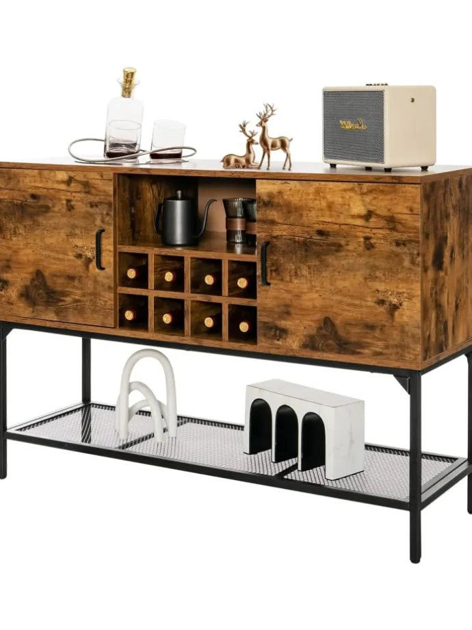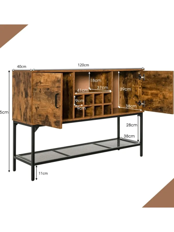 Unser multifunktionaler Schrank ist eine ideale Aufbewahrungslösung für Sie und Ihre Familie. Sie können ihn je nach Ihren unterschiedlichen Bedürfnissen als Sideboard, Schrank oder Konsolentisch verwenden. Er verfügt über ausreichend Stauraum, darunter eine breite Arbeitsplatte, ein offenes Regal, ein Weinregal für 8 Flaschen, zwei Türschränke und ein unteres Metallgitterregal. Somit können Sie Ihren Wein, Obst, Gläser, Einmachgläser oder Geschirr frei auf ihm abstellen. Dieser aus hochwertigen Materialien gefertigte Schrank mit solidem Metallrahmen wird Ihnen und Ihrer Familie jahrelang gute Dienste leisten.