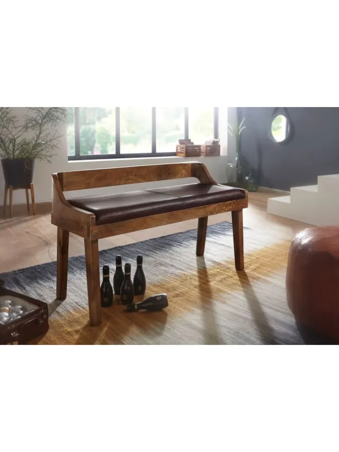 Dank der robusten Massivholzbeine steht die Sitzbank sicher und stabil. Die weiche Polsterung sorgt darüber hinaus für ein angenehmes Sitzgefühl. Das strapazierfähige Echtleder in Braun verleiht der Sitzfläche eine edle Optik und kommt gut mit den massiven Holzbeinen harmoniert.