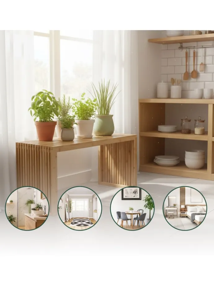 Diese Bambusbank für Flur, Bad und Küche begeistert durch ihr unaufdringliches Lamellen-Design. Die minimalistische Küchenbank ohne Lehne spielt mit Licht, Schatten und Struktur und passt sich mühelos modernen Stilwelten wie Skandi, Japandi oder Boho an. Ihre kompakte Form macht sie zum flexiblen Hingucker in kleinen Räumen. In der Flurbank vereinen sich sicherer Stand und hochwertige Verarbeitung mit zeitloser Ästhetik. Ihre klare Formensprache zeigt, wie schön Reduktion sein kann.