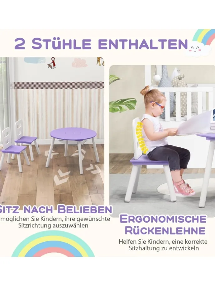 Komplettes Set aus Tisch und 2 Stühlen ist ein ideales Geschenk für Kinder