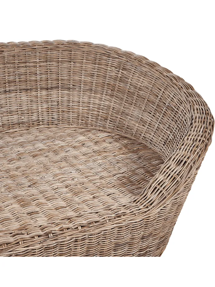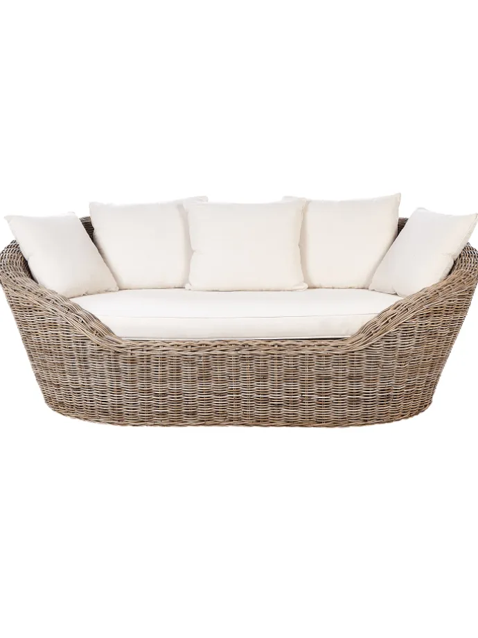 Liegeinseln für 2 Personen aus Rattan mit Kissen. Entspannen Sie sich in dieser handgefertigten, sorgfältig geflochtenen Rattan-Liege, die sowohl Stil als auch Komfort bietet. Lassen Sie sich in die weichen Sitzkissen sinken und lehnen Sie sich an die fünf mitgelieferten Kissen, die für maximale Bequemlichkeit sorgen. Dank der integrierten Reißverschlüsse sind die Bezüge abnehmbar und leicht zu pflegen, damit Ihr Rückzugsort Tag für Tag frisch und einladend bleibt.