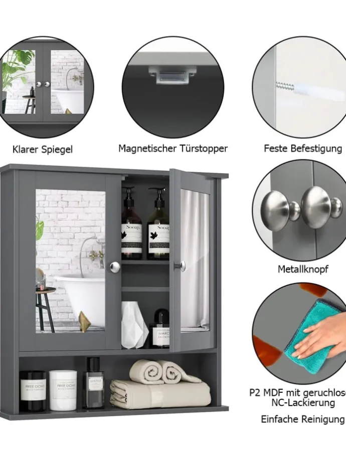 Unser Badschrank mit Spiegel ist praktisch und mit hochwertiger Verarbeitung, das zeitlos-elegante Design fügt sich in jedes Badezimmerinterieur harmonisch ein. Es bietet viel Stauraum, damit man die Badutensilien wie Bodylotion und Zahnbürsten verstauen kann. Auf einer Spiegelfläche kann man jeden Tag auf das Neue betrachten und nett zurechtmachen.