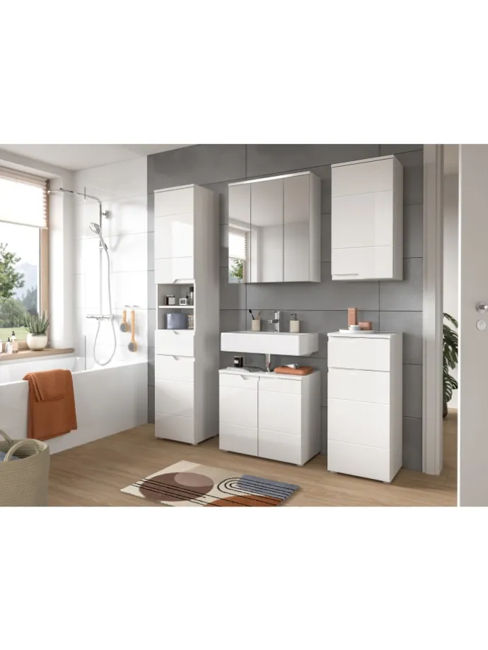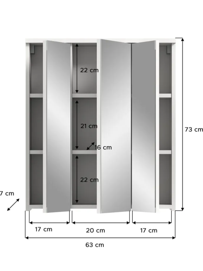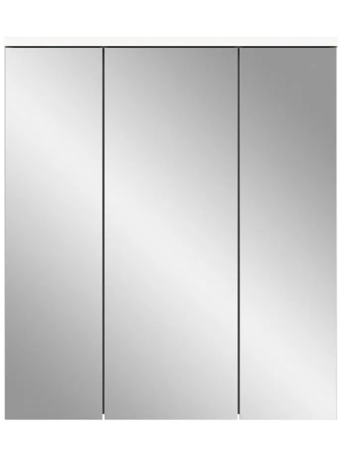 Der elegante Spiegelschrank (B/H/T: 63x73x21 cm) überzeugt durch modernes Design und praktische Funktionalität. Die Hochglanz-Front in Weiß verleiht dem Möbelstück eine stilvolle Optik, während die drei Spiegeltüren den Raum optisch vergrößern und für zusätzliche Helligkeit sorgen. Mit sechs variablen Einlegeböden bietet der Spiegelschrank ausreichend Platz für die ordentliche Aufbewahrung von Badutensilien. Die Türen sind mit einer Softclose-Funktion ausgestattet, die ein leises und sanftes Schließen garantiert. Gefertigt aus FSC®-zertifiziertem Holzwerkstoff steht der Schrank für nachhaltige und umweltbewusste Produktion. Dieses Möbelstück ist die perfekte Kombination aus Design, Funktionalität und Nachhaltigkeit für jedes moderne Badezimmer.