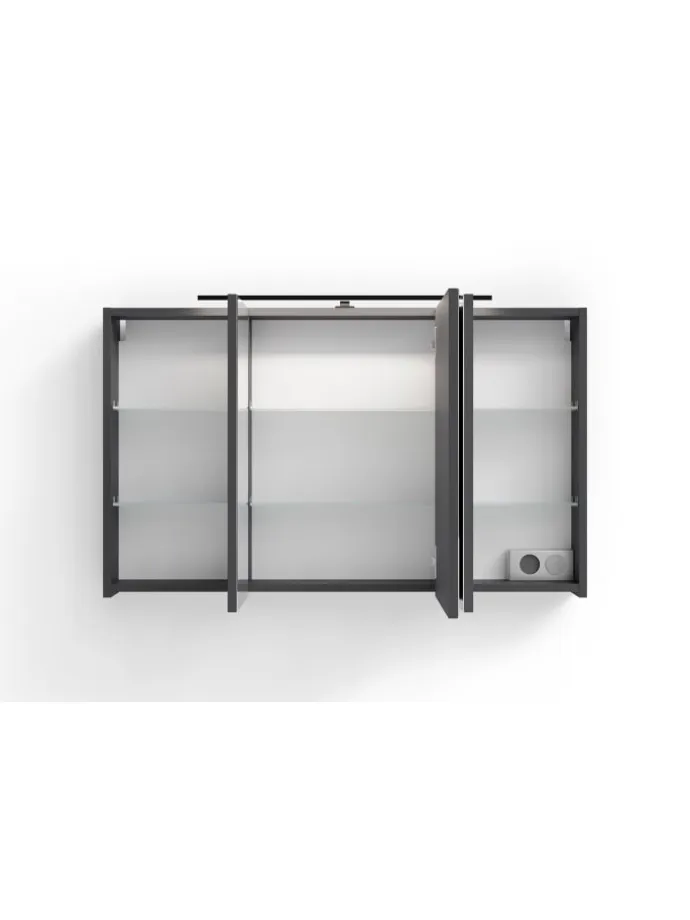 Die Spiegelschränke SPREE sind in den Breiten 40, 50, 60, 70, 90, 100 und 120 cm verfügbar. Dabei sind sie besonders gut ausgestattet, mit mehreren, verstellbaren Glas-Einlegeböden, Soft-Close Scharnieren für die Türen sowie einer LED Stableuchte. Zusätzlich findet man im Inneren des Schrankes noch eine praktische Schalter- und Steckerbox. Der Korpus ist in matt weiß oder anthrazit erhältlich. Die Spiegeltüren können bei Breiten mit einer Tür wahlweise mit dem Anschlag rechts oder links montiert werden.
