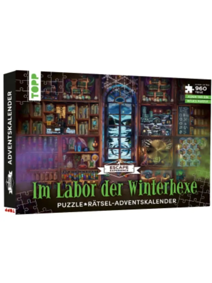 Puzzeln, Rätseln, Geheimnisse erkunden! Der Puzzle-Adventskalender für alle Escape-FansIn diesem Adventskalender warten 24 kleine Puzzle auf dich! Begib dich in das Labor der Winterhexe, erkunde ihr verwunschenes Bücherregal und löse die Rätsel. Durch die 24 Schächtelchen mit Puzzlen und Rätseln wird bereits die Adventszeit zum Fest!Das erwartet dich:Puzzle-Adventskalender mit 960 Teilenan 24 Tagen jeweils 40 neue Puzzleteilejedes fertige Bild enthält ein kniffliges Escape-Rätselausführliches Booklet mit Story, Hinweisen und LösungenSpieldauer: ca. 10 Minuten pro TagAltersempfehlung: ab 10 Jahren