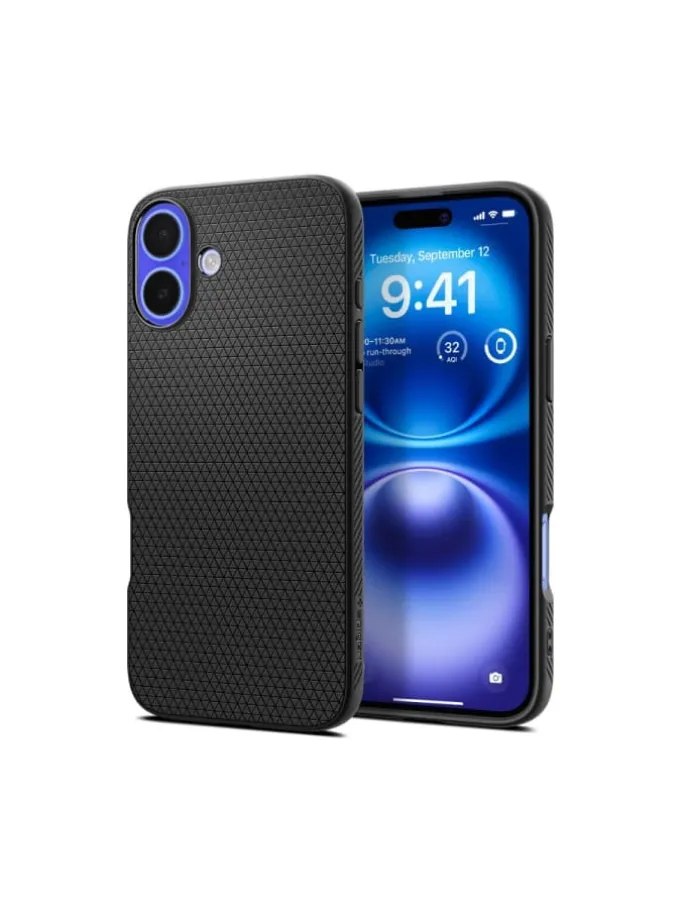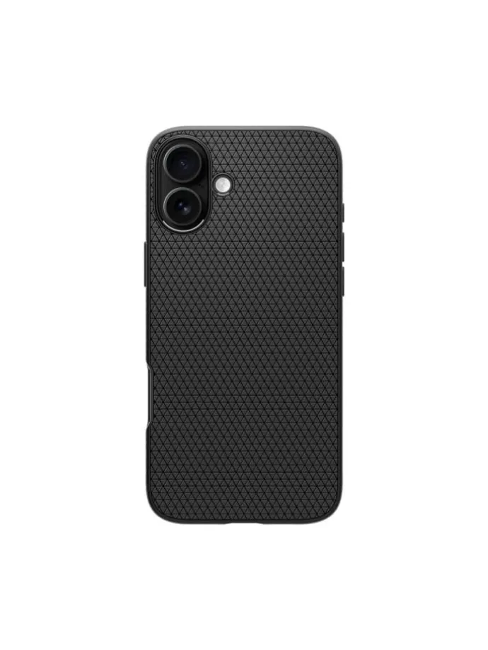 Die Spigen Liquid Air Hülle schützt das iPhone 16 mit flexiblem TPU und rutschfestem, mattschwarzem Oberflächenfinish.