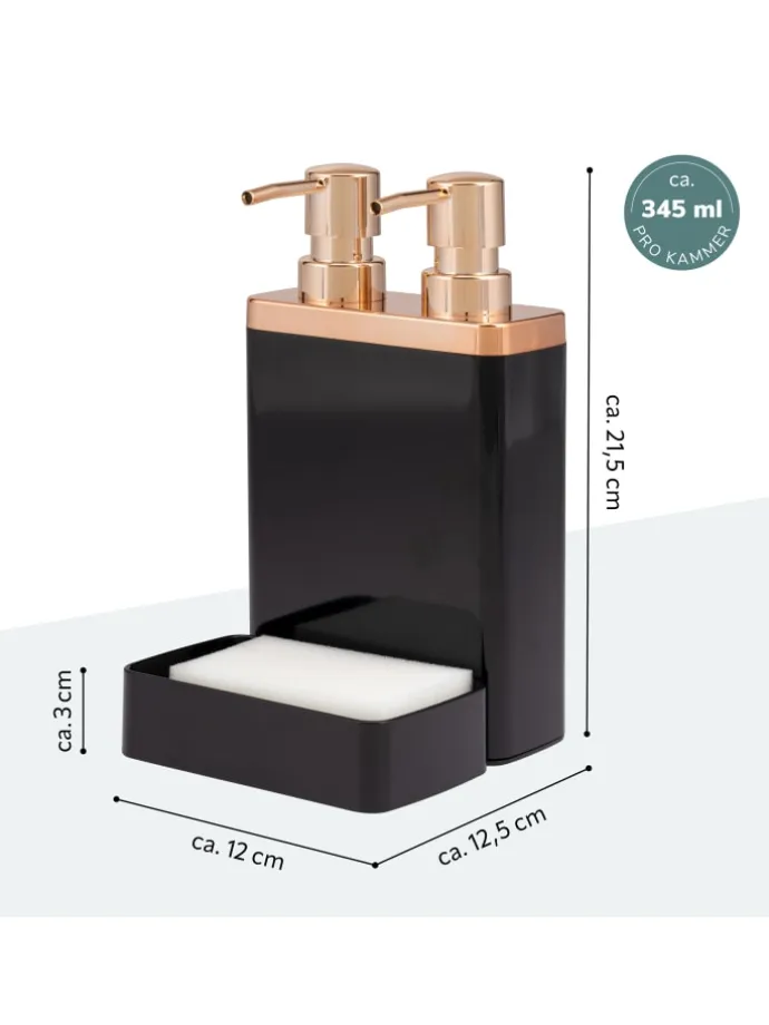 Selbige fungiert gleichzeitig als Halterung für den passenden beiliegenden doppelseitigen Schwamm. Das Spülmittel ist in einer Kammer des Spenders stets parat, während Sie auch Handseife oder Desinfektionsgel in die andere Kammer füllen können.